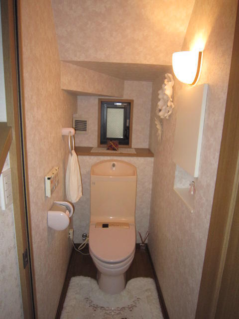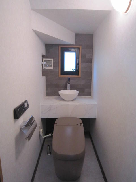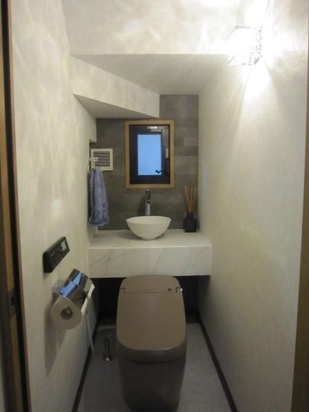 リフォーム前は、淡い花柄の壁紙に白を基調としたやわらかい雰囲気のトイレでしたが、階段下ということもありやや圧迫感がありました。そこで、タンクレスの便器を採用し奥のカウンターに自動水栓の手洗器を設置、カウンターには大理石調のタイルを張りました。また、タンクレスの便器とカウンターの高さも下げたことで目線も下がり、圧迫感も解消されました。ノーブルトープカラーの便器とアクセント壁のエコカラットでシックで上品な空間になりました。