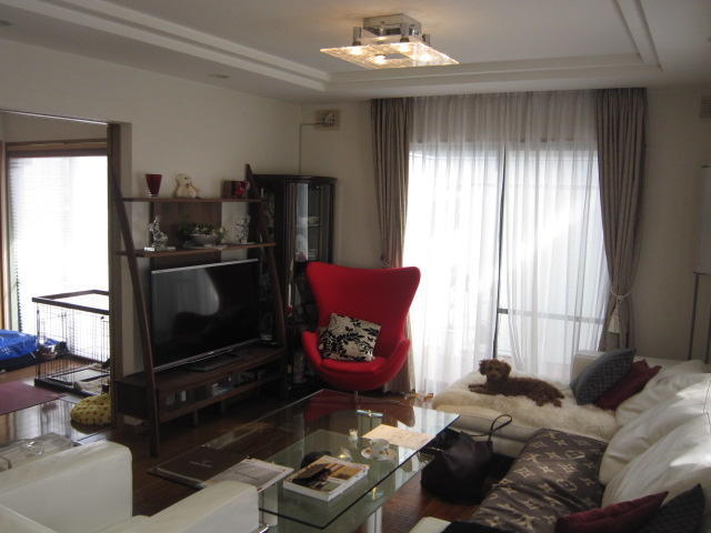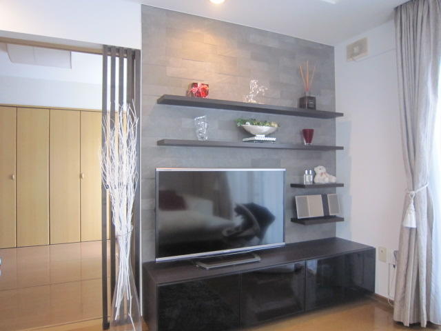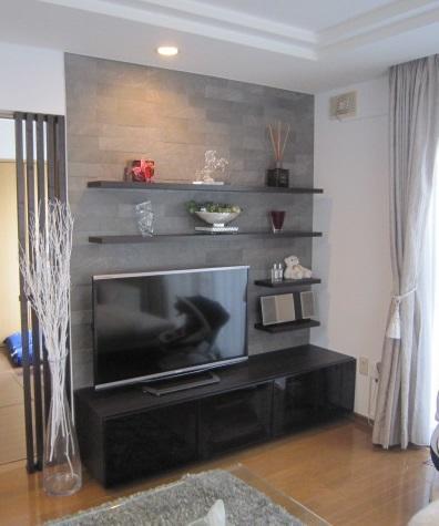以前トイレのリフォームをされたお客様で、今回はLDKのクロスの張替えとエコカラット張りなどの内装リフォームをしました。テレビ台とディスプレイ棚はLIXILのヴィータスを組み合わせ、壁にはエコカラットを張りました。テレビ台脇の開口部に設置したタテ格子がアクセントになっています。