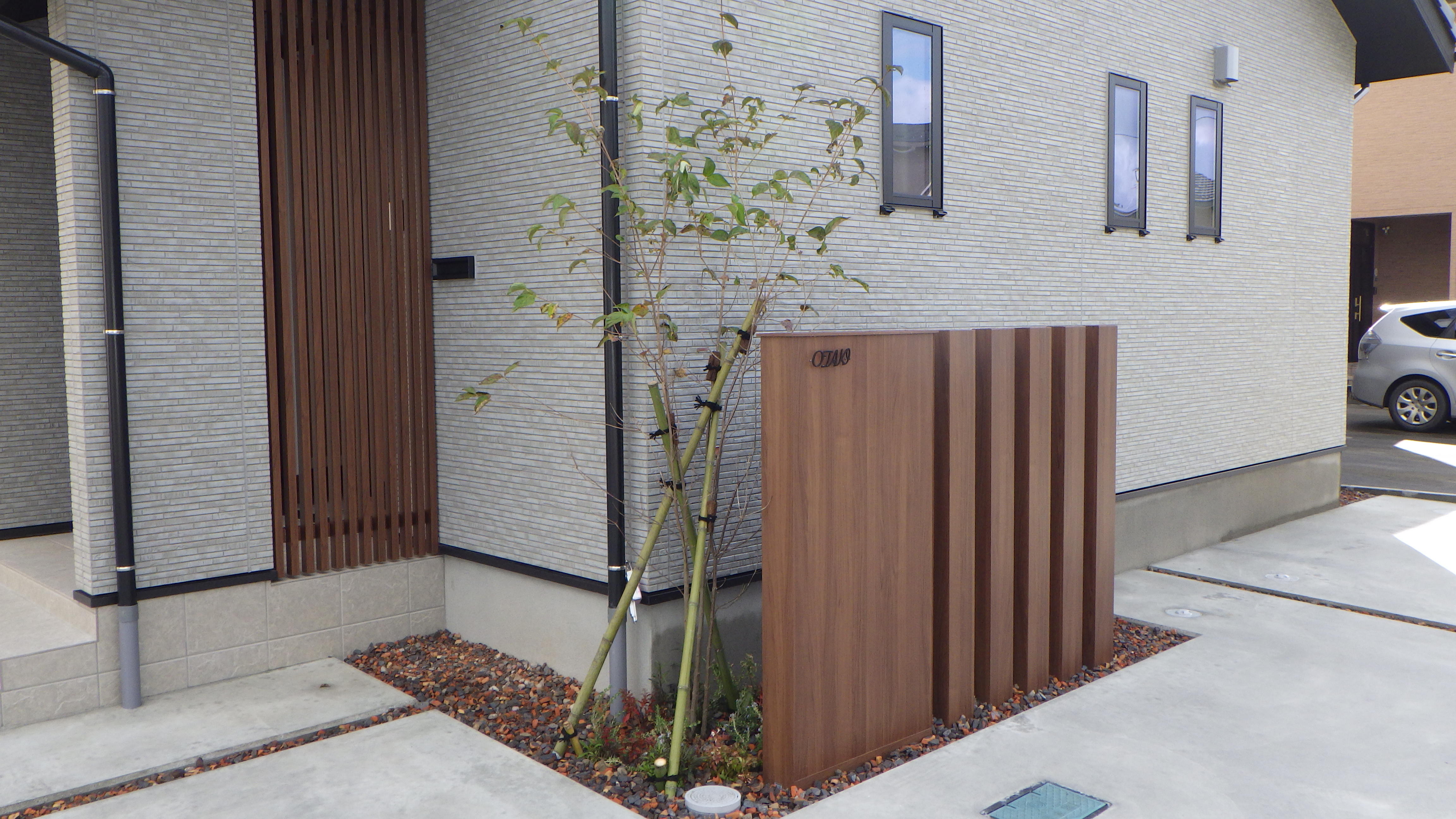 玄関脇にシンボルツリーとなるヤマボウシを植えました。道路と敷地をさりげなく分ける枕木材も家のアクセントになっています。ポーチには玄関ドアを開けた時に目隠しにもなる格子を組み込みました。