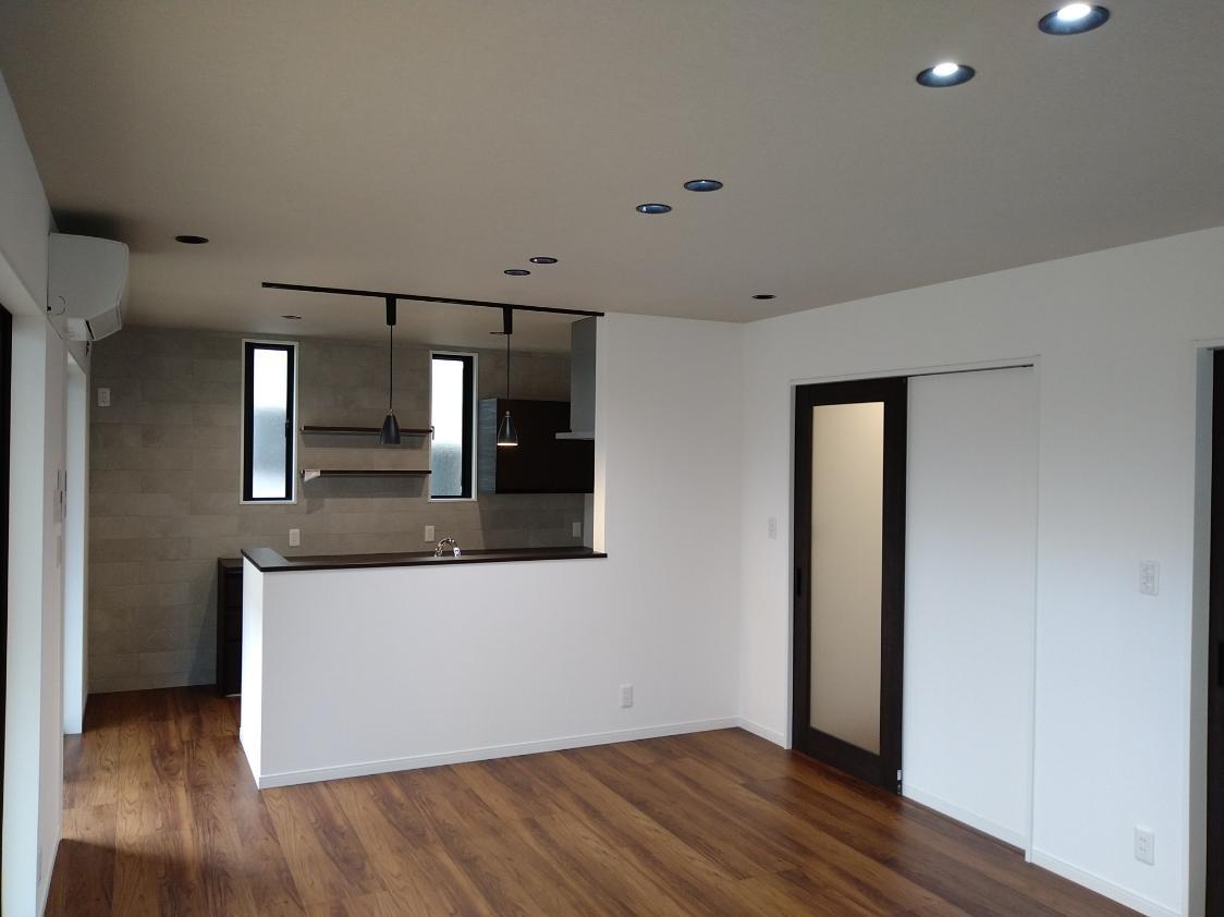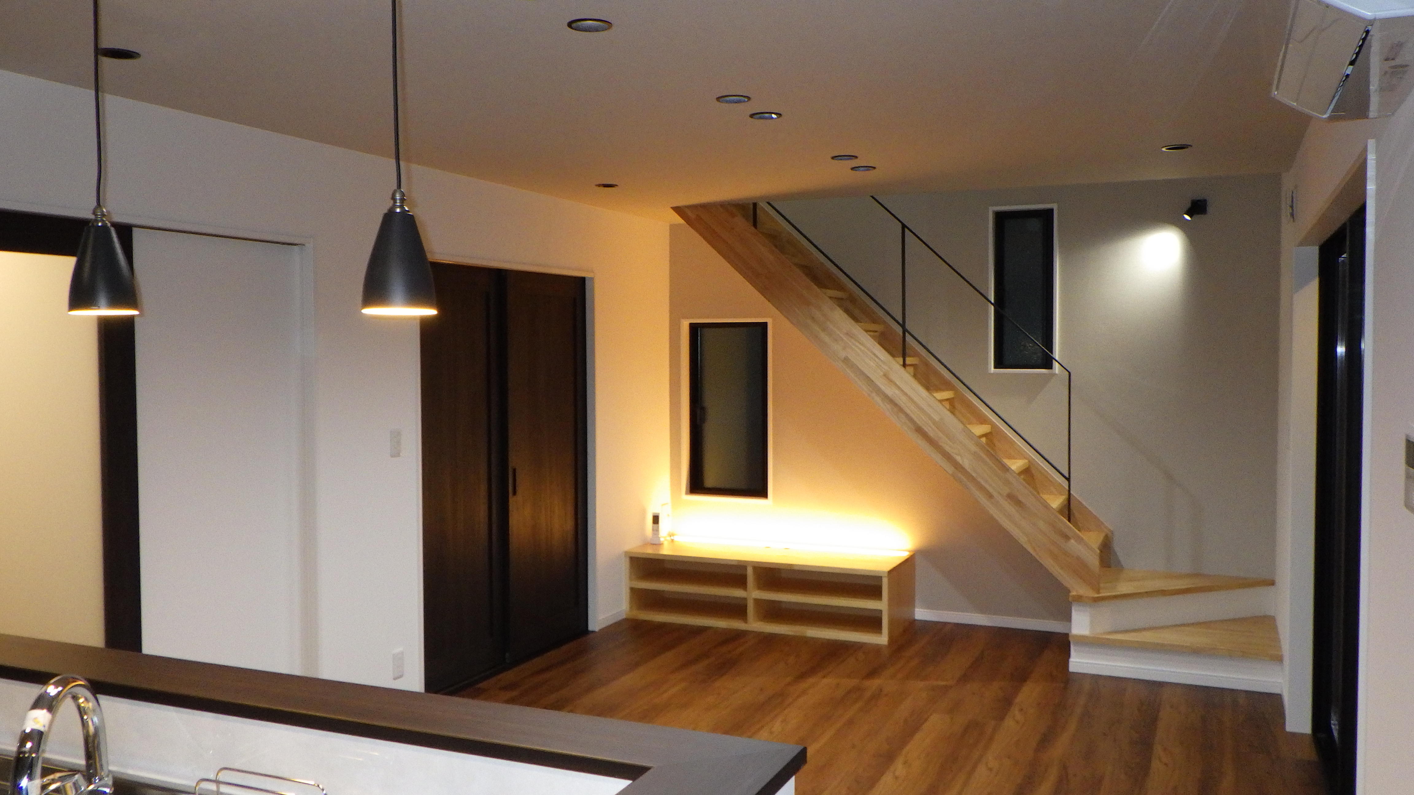 オープン階段の下を利用して間接照明を組み込んだテレビ台を造作しました。夜はメイン照明を暗くし雰囲気のある空間になります。対面キッチンからは奥様がお料理中でもご家族が帰ってきた様子や和室、階段など全て見渡すことが出来ます。また、リビングから外へ出られるデッキも設置しました。床材:LIXILラシッサDフロア チークF室内建具:LIXILラシッサS クリエダーク