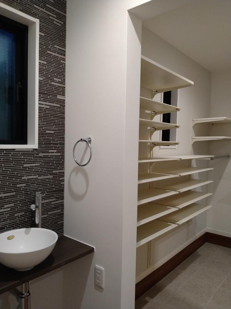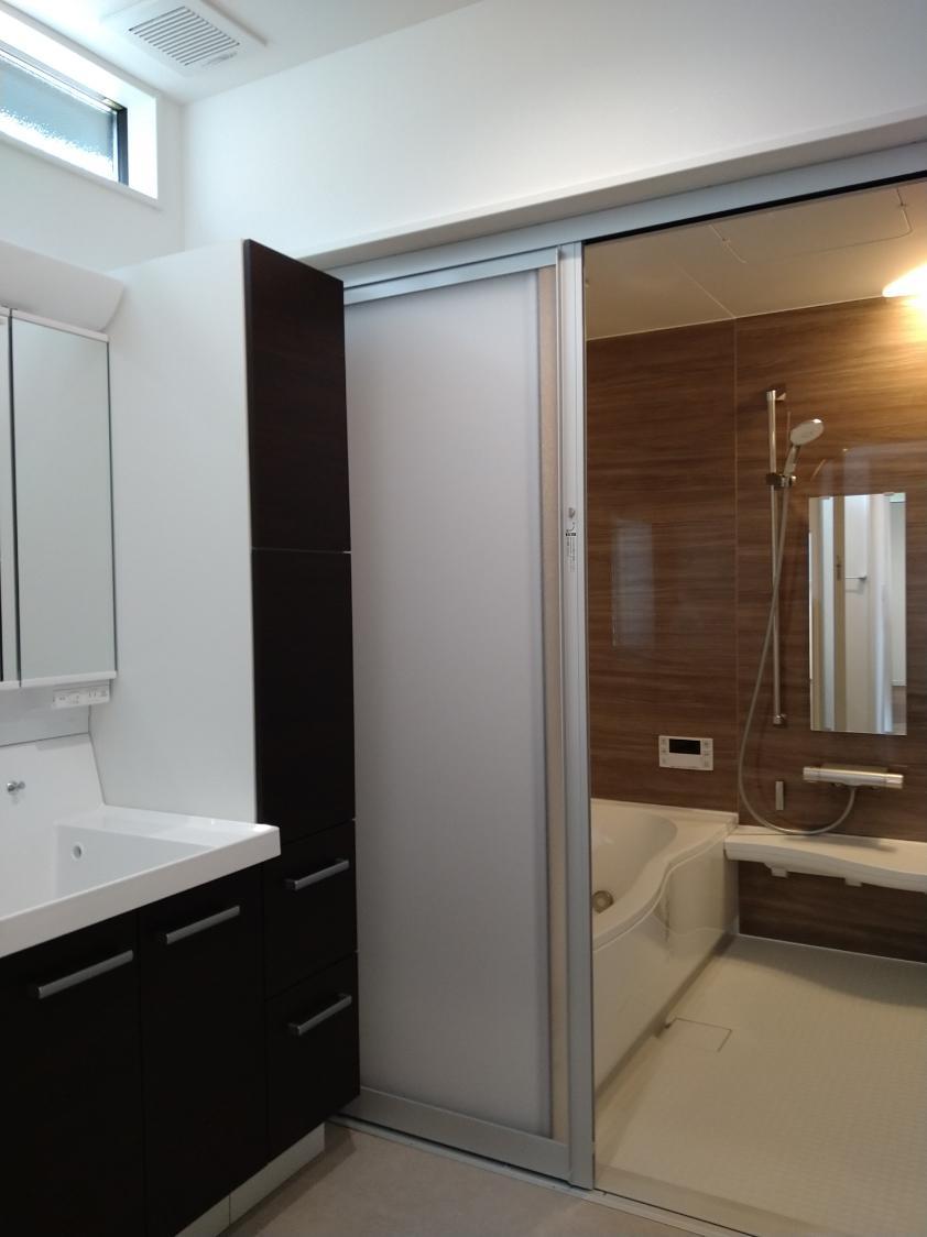 家事室から廊下をはさんで洗面脱衣室と浴室があります。洗濯機は家事室に設置したのでゆとりのある洗面脱衣室になっています。視線も考慮し壁いっぱいに洗面化粧台を設置、上部に横長の窓を取付けました。洗面化粧台の向かい側も壁一面の収納棚です。ユニットバス:LIXILアライズ洗面化粧台:LIXILピアラ