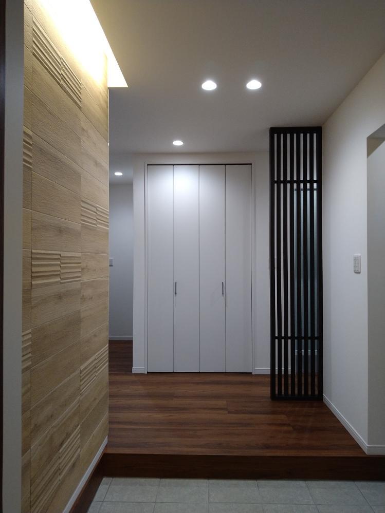 ご家族はシューズクロゼットから出入り出来るようにしました。帰宅後部屋へ入る前に玄関で手洗いが出来ます。壁には水はねも考慮しボーダータイルをアクセントに張りました。手洗器:LIXILどこでも手洗
