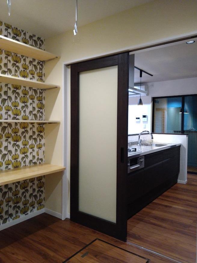 奥様こだわりの家事室は、キッチンから家事室、洗面脱衣室、バスルームと続いています。洗濯~物干し~アイロンがけ と全てこの部屋だけで作業が出来ます。アクセントクロスを張った壁面には可動出来る棚板とカウンターを設置しました。システムキッチン:LIXILアレスタ