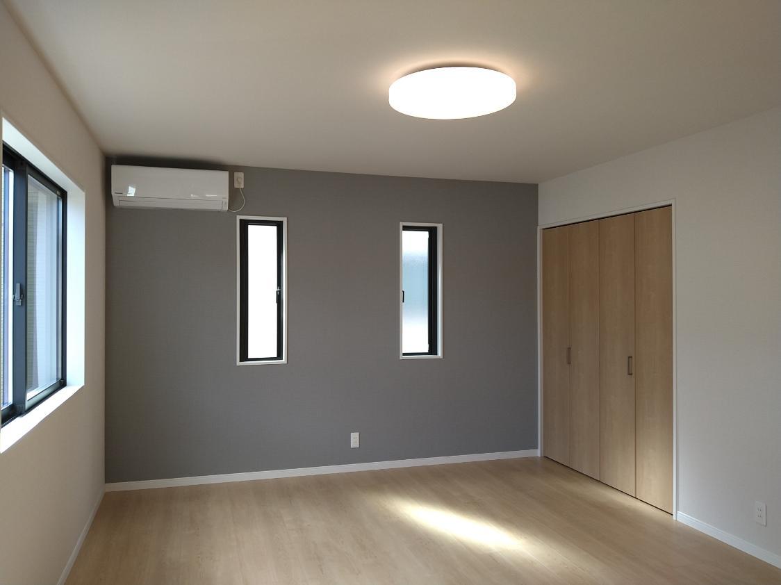 2階は1階と雰囲気を変え、床も建具も明るいカラーのものを選定しました。寝室の壁は一面のみアクセントにグレーのクロスを張り落ち着いたイメージにしています。手前に寝室から続いているご主人様の書斎があります。