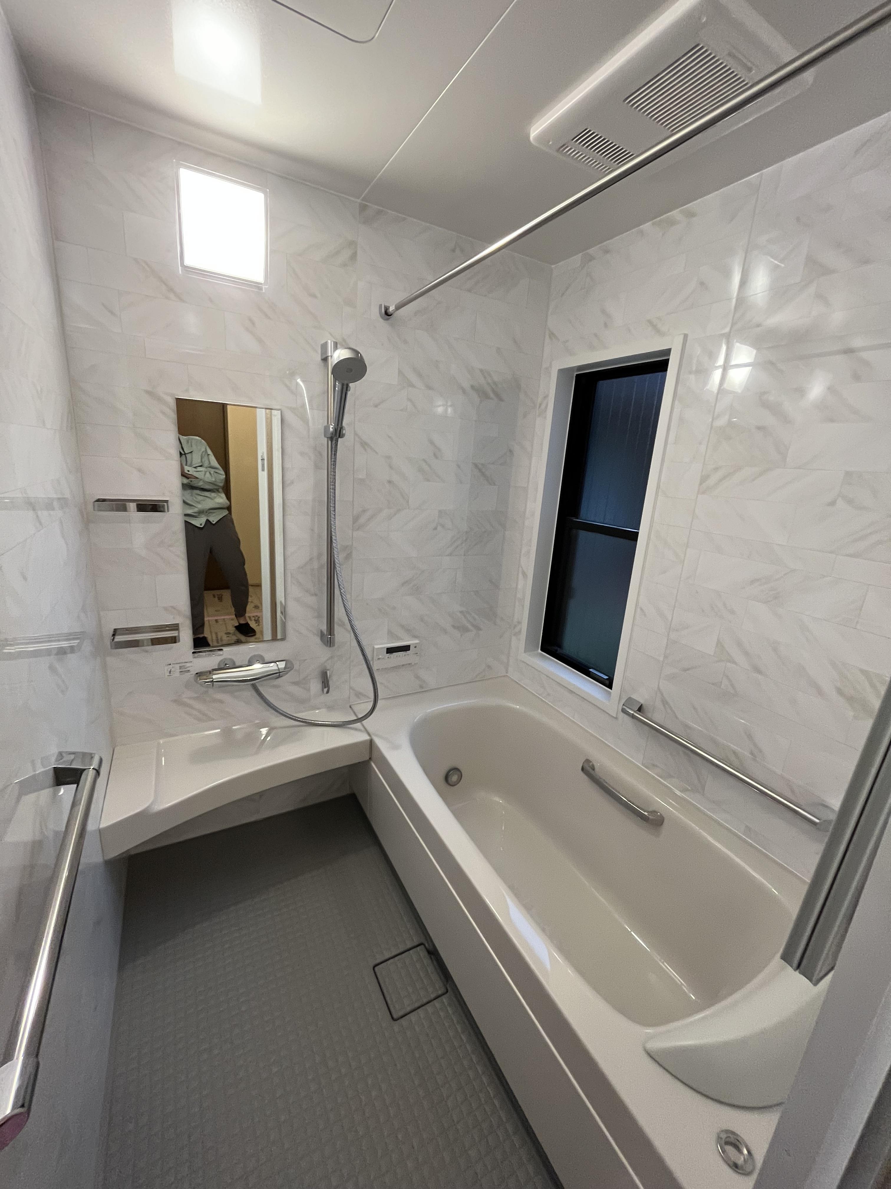1坪のユニットバスからユニットバスへの入替えです。天井・壁・床「まるごと保温」が標準仕様のスパージュを採用。お湯が冷めにくい保温浴槽「サーモバスS」や換気乾燥暖房機も設置、また、窓もカバーリングで断熱窓(LIXIL リプラス)へ入替えたので、これからは冬場の寒さも安心です。