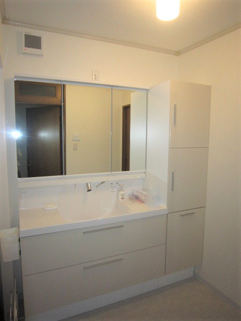 今までは洗面カウンターの正面に窓があったため、カウンター自体は広々としていましたが、収納スペースが少なくミラーも小さなタイプしか設置出来ませんでした。そこで、窓はつぶし大きな3面鏡のミラーキャビネットを採用、洗面脇には45㎝幅のトールキャビネットを設置しました。