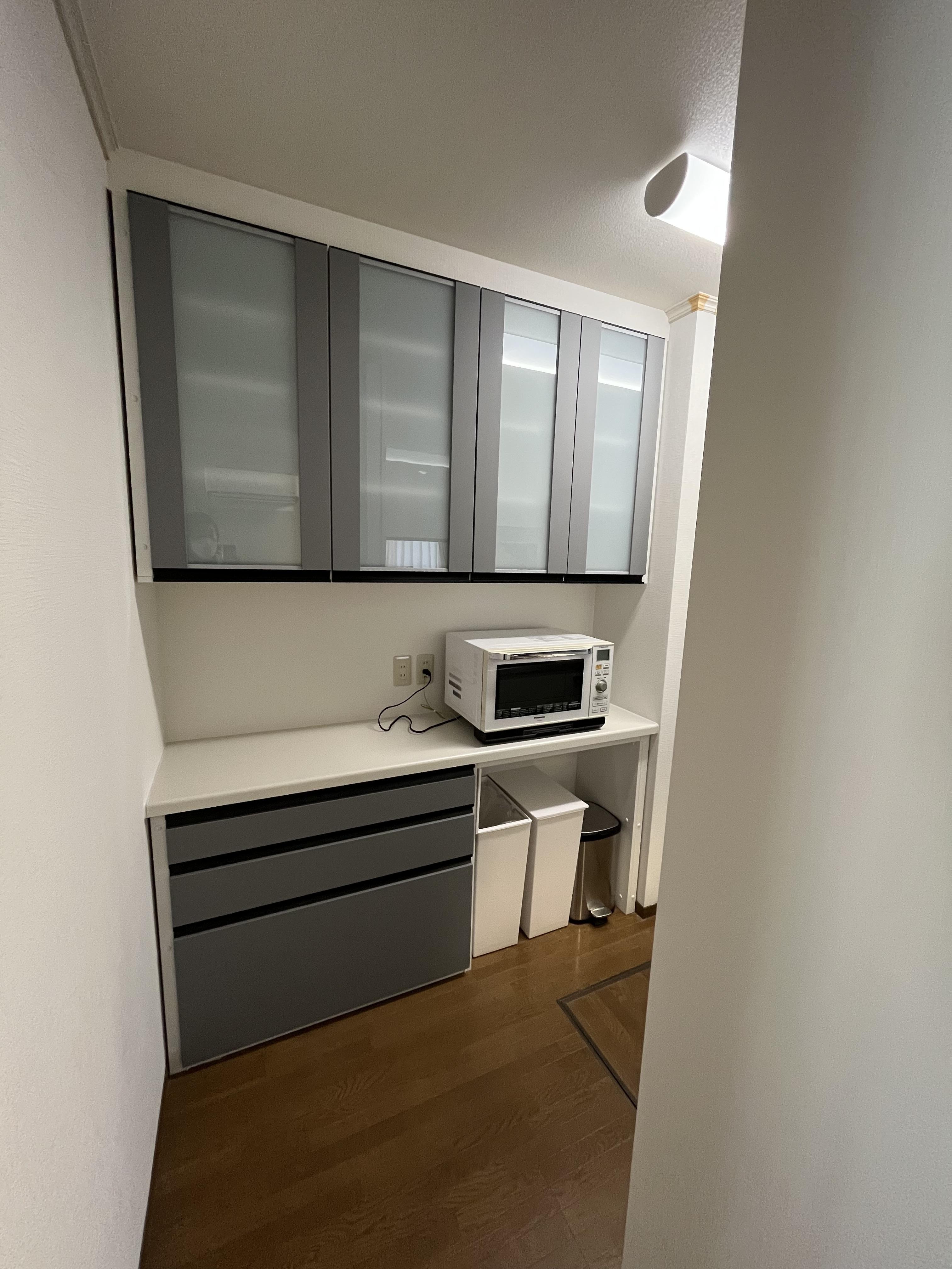 当初は食器棚と家電収納は既存のまま使用する予定でしたが、キッチンを気に入っていただき、収納も併せて入れ替えることになりました。フロアキャビネットは収納量のある引出しタイプにしたので、あえてオープン部分を設けゴミ箱スペースとしました。こちらはシックなグレーの扉です。