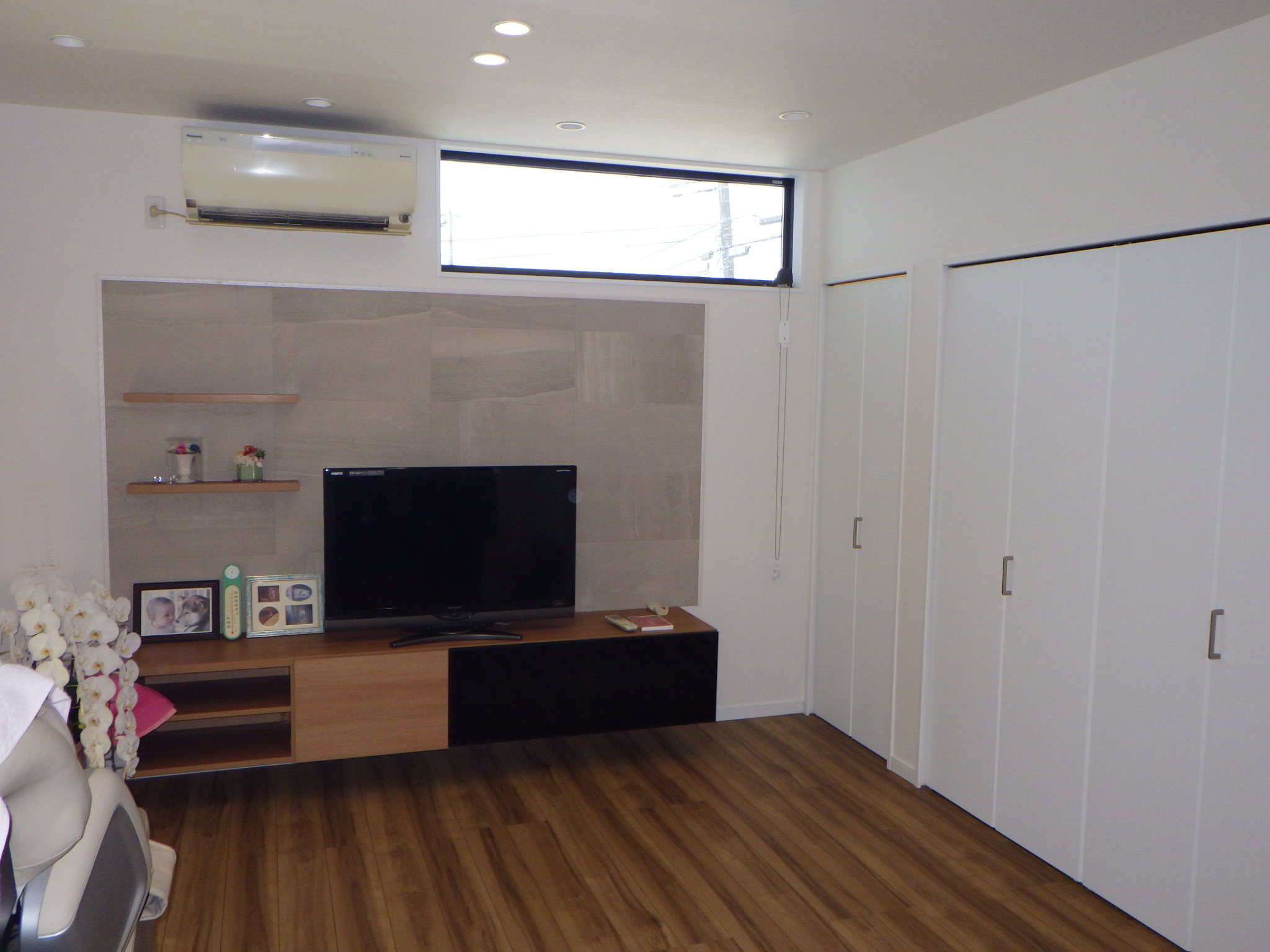 LIXIL断熱サッシ「サーモスⅡ-H」、テレビ台「ヴィータス」今までは台所と襖で仕切られた和室のリビングでした。窓も多く冬は寒い、段差もあり安全面も心配でした。そこで、キッチンとつなげ、ワンルームのLDKに改装しました。窓は全て断熱窓へ入替え、押入はスッキリとした白い扉のクロゼットにしました。壁付けのテレビ台を設置し、アクセントにエコカラットも貼りました。