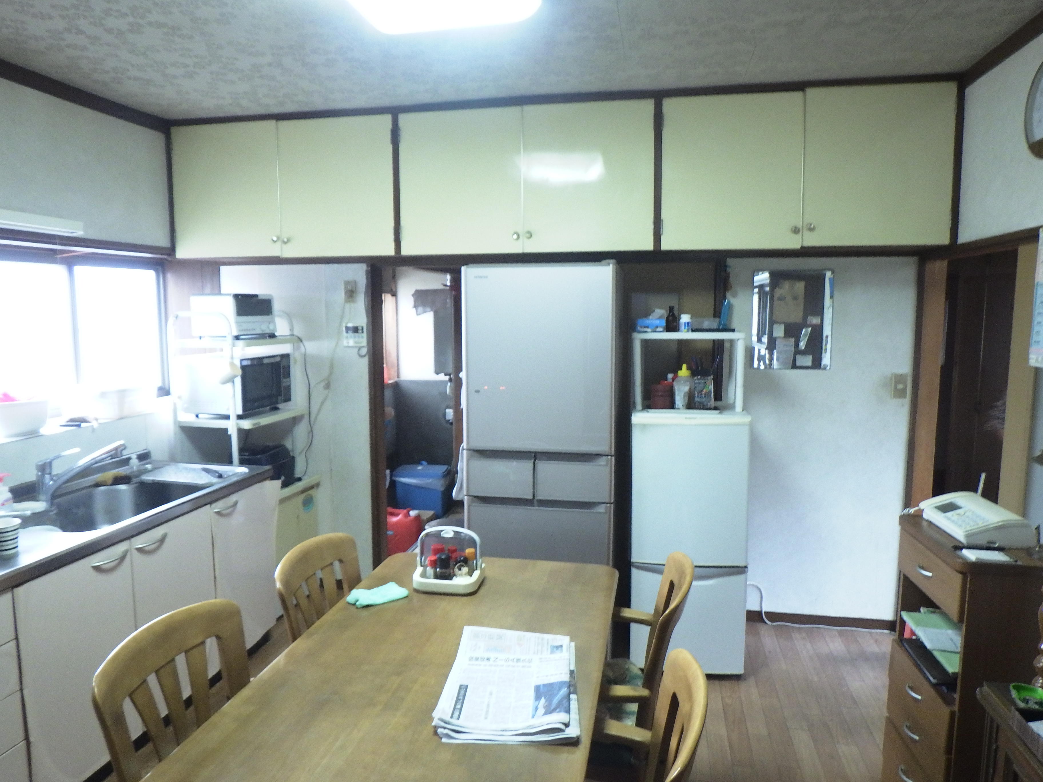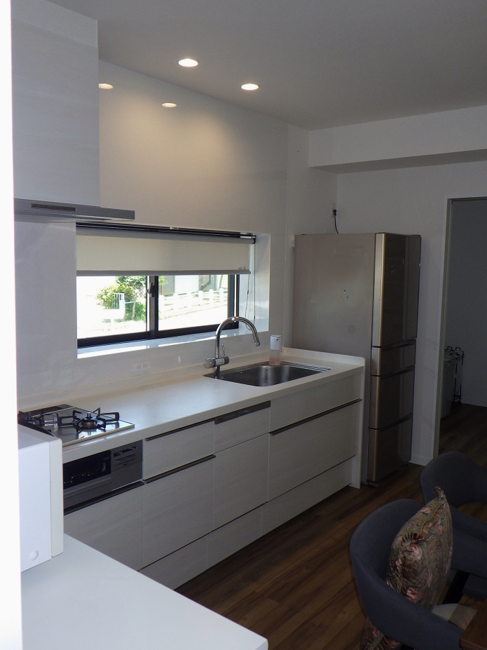 LIXILシステムキッチン「シエラS」対面、L型などいろいろなキッチンのご提案をしましたが、最終的に使い慣れた勝手は変えずに、既存と同じ壁付けのキッチンに落ち着きました。レンジなど家電置き場は、コンロの脇にL型のカウンターを造作し、スッキリと。カウンター下はオープンなので、既製品のカゴを置いたりゴミ箱などの置き場にも出来ます。今までは、台所に冷蔵庫が2つあり、ダイニングテーブルと大きな食器棚も置かれていたので、スペース的にも余裕がありませんでした。もともと台所の隣に4.5帖の納戸があったので、そこをパントリーに改装し、可動棚を設置。2台目の冷蔵庫や普段使わない食器、食品のストック置き場としました。