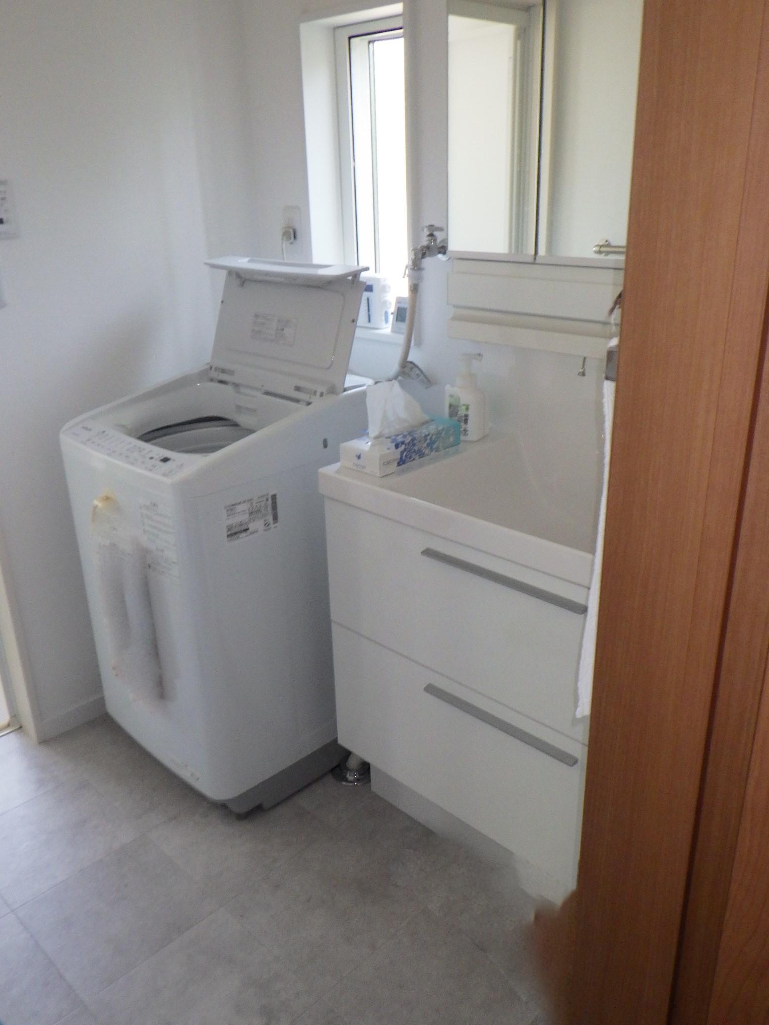 LIXIL洗面化粧台「エルシィ」※現在廃番品今までは壁いっぱいに窓があり、洗濯機と洗面台の設置出来る位置が限られていました。大きな窓でしたので明るさは十分なのですが、やはり冬場は寒く、洗面台も使い勝手があまりよくありませんでした。そこで、窓を小さくし、洗面化粧台のミラーが設置出来る壁面を設け、収納もたっぷりの洗面化粧台を設置。淡いグレーとホワイトの清潔感のある内装で、明るく暖かい洗面脱衣室になりました。
