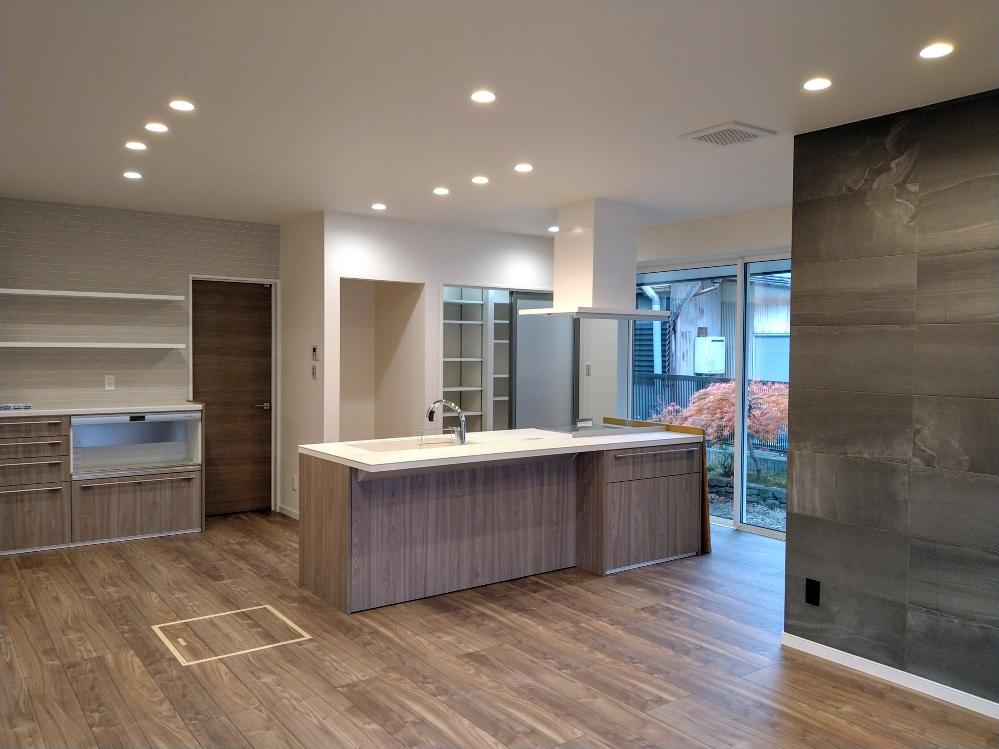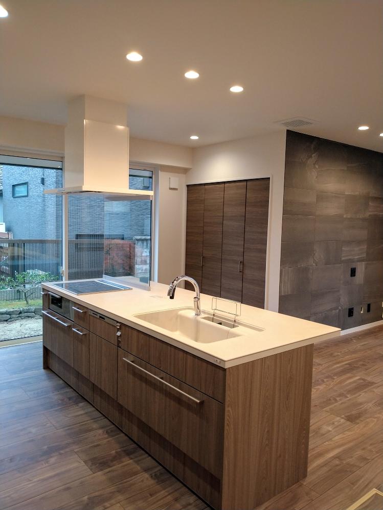 約24帖のLDKにアイランド型のキッチンをメインに設置しました。キッチンはLIXILの最上級モデル「リシェル」を採用。10年間お手入れ不要なレンジフード「よごれんフード」や、熱にもキズにも強い天板「セラミックトップ」、タッチレス浄水栓、食洗機などの最新設備で、ご夫婦二人で楽しくお料理が出来ます。キッチンの背面側にはパントリーを設け収納も充実させました。また、お料理のニオイも、壁の一部に張った「エコカラット」が脱臭してくれるので気になりません。(システムキッチン:LIXILリシェル)