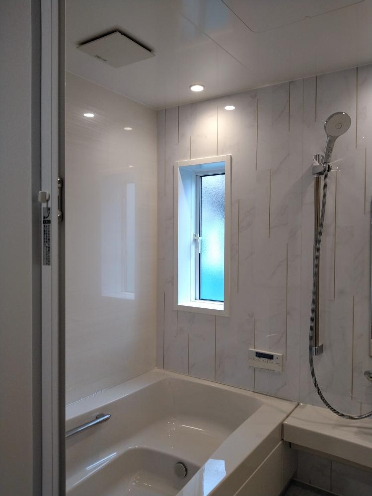 お子さんと一緒にゆったり入浴できる1.25坪の広々としたユニットバスです。壁は白を基調とし、ゴールドのラインがアクセントに入ったデザインのパネルを採用。明るく清潔感のある浴室になりました。(ユニットバス:LIXILスパージュ)