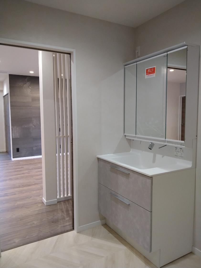 洗面化粧台はシンプルデザインですっきりスマートなLIXILの「エルシィ」を採用。使い勝手の良い2段のフルスライドタイプの引出しです。洗面化粧台の向かい側には、扉のついた収納スペースとオープンの可動棚になっており、見せたくない物と、普段使いの洗剤やタオルなど、分けて収納出来るようにしました。(洗面化粧台:LIXILエルシィ ※2024年現在は廃番。後継機種:クレヴィ)