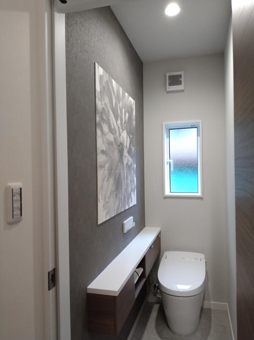 タンクレス便器「サティスS」に足元がスッキリのフロートタイプのカウンター「キャパシア」を採用しました。壁には、奥様がショールームで気に入っていただいた「エコカラット」を張りました。こちらのエコカラットは、絵を飾る感覚で手軽に壁の一部に張るデザインタイプのエコカラットです。約30㎝角のエコカラットを9枚組み合わせると1枚の絵画のようになります。また、手洗い器はあえてトイレ内に設置せず、帰宅時や来客時にも兼用で使用出来るよう、トイレを出たところに配置しました。(便器:サティスS、カウンター:キャパシア)