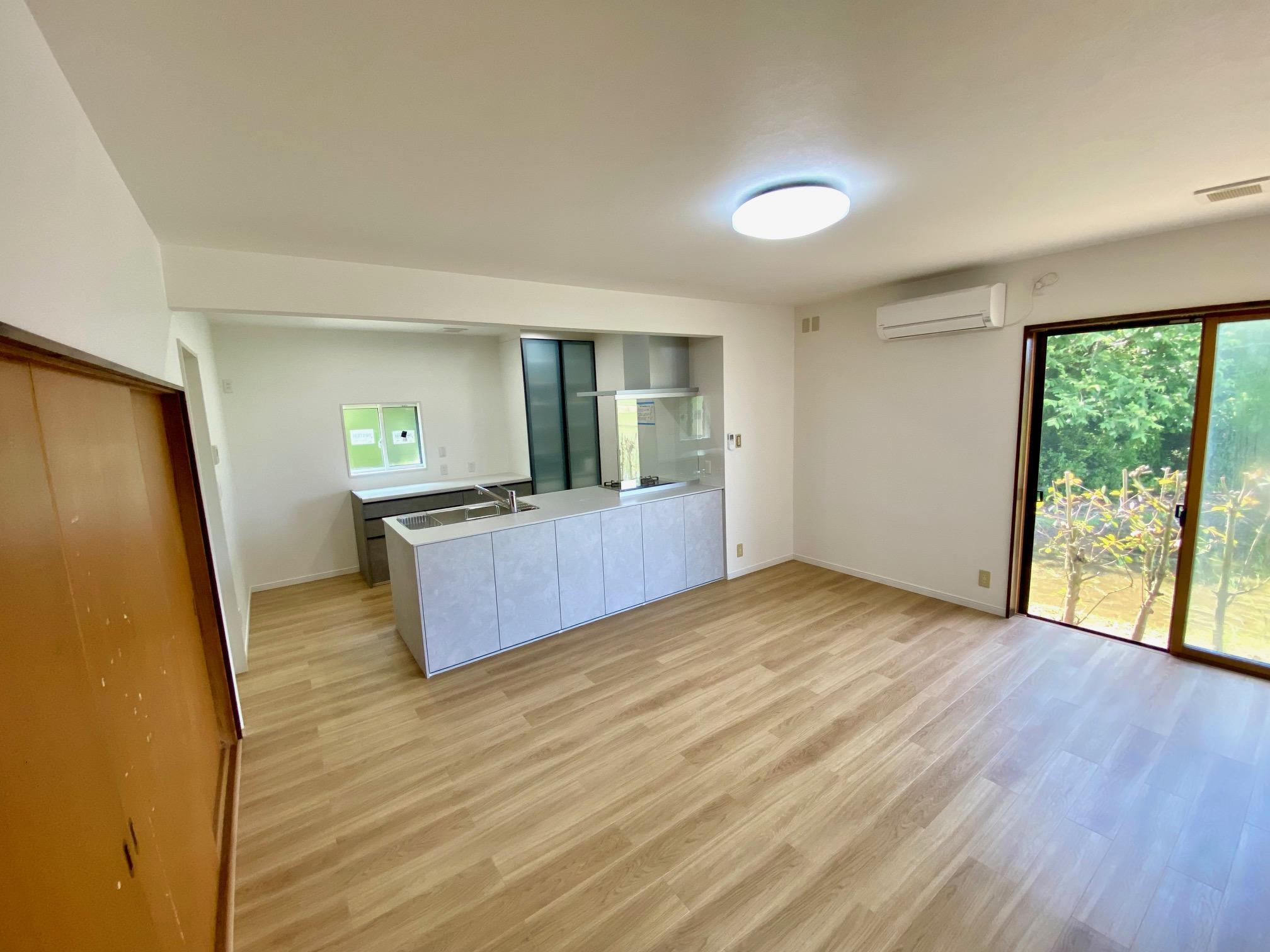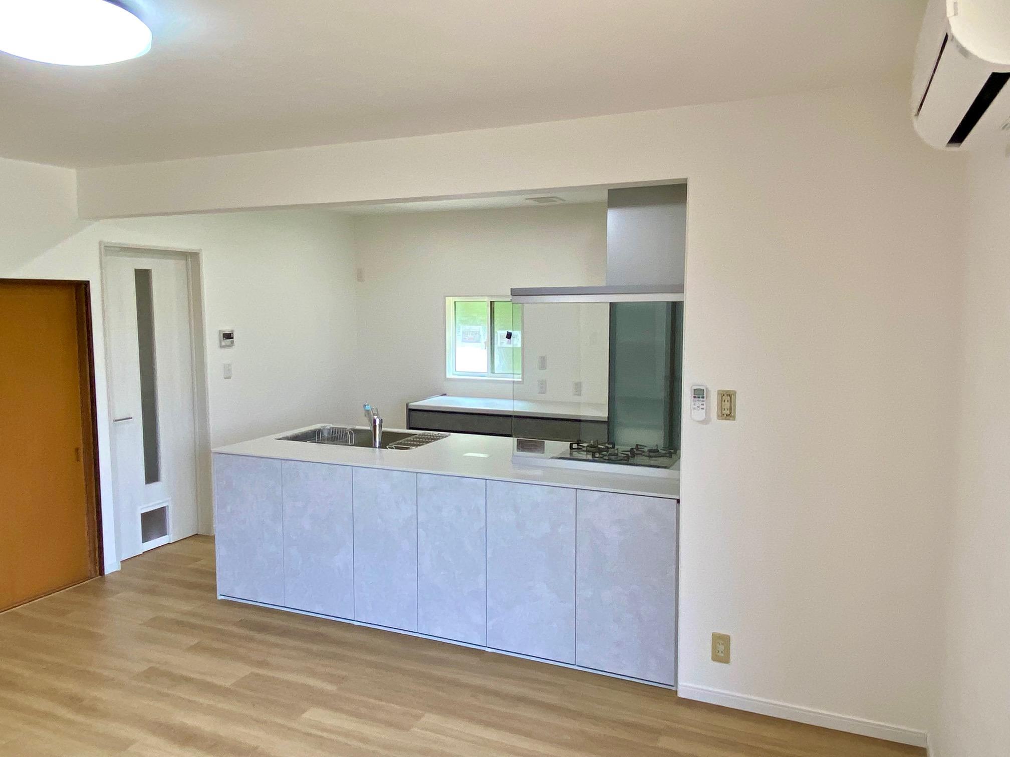 リフォーム前は、西側に面した独立キッチンでした。断熱材は入っておらず、エアコンもなかったため、冬は寒く、夏は西日で非常に暑く、キッチンに立つのが大変でした。親子3世代のご家族ですが、家事スペースも狭く、協力しづらい状況でした。そこで、まずは快適な室温環境の為の断熱化と、リビングとの間仕切りを撤去し、キッチンの対面化のご提案をしました。リビングと繋ぐことで、ゆったりと作業スペースがとれるキッチンになり、また、会話を楽しみながらお料理も出来るようにしました。