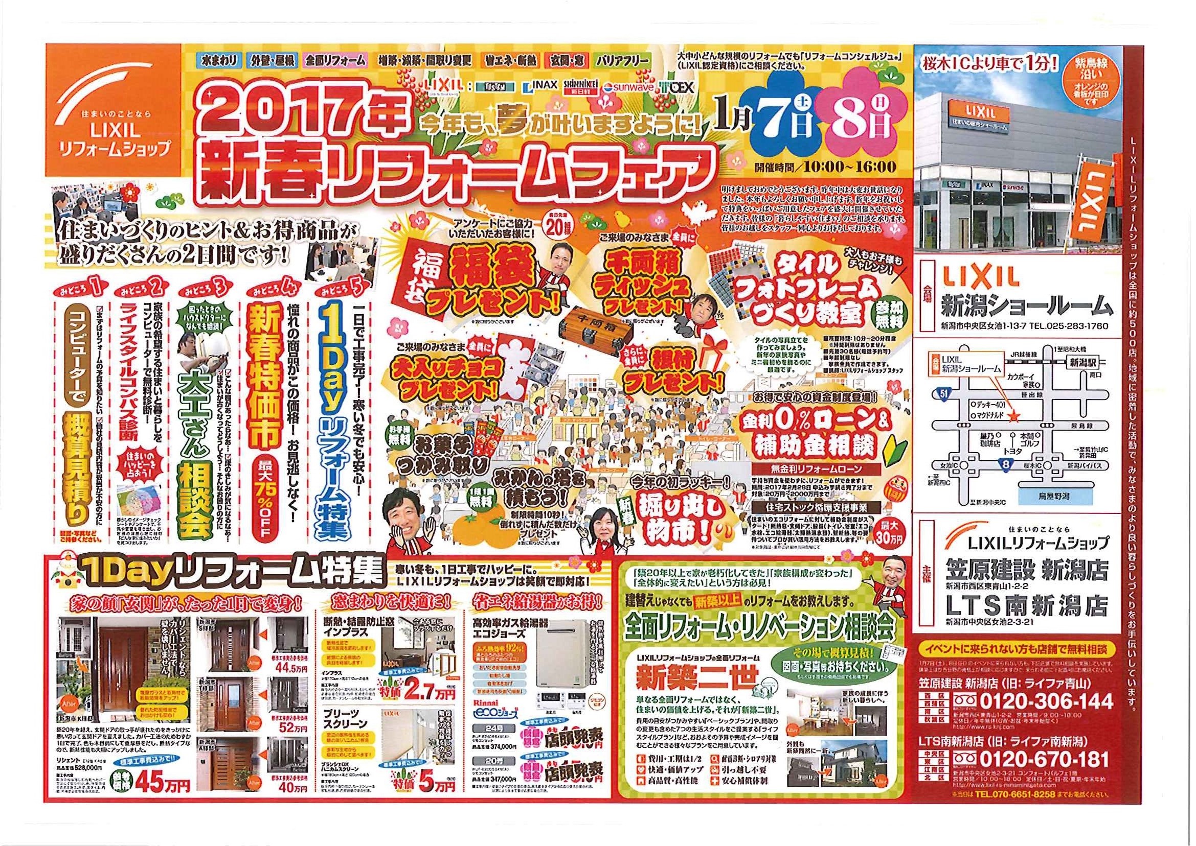 2016年は大変お世話になりました。2017年もスタッフ一同、よりパワーアップして頑張っていきたいと思いますので何卒よろしくお願い申し上げます。さて、LIXILリフォームショップ 笠原建設 新潟店では、1月7日(土)と8日(日)の2日間新年をお祝いして特典いっぱいのイベント「2017年新春リフォームフェア」を開催致します。住まいづくりのヒント&お得商品が盛りだくさんの2日間です。寒い冬も一日で工事が完成する1Dayリフォーム特集やご来場プレゼントも多数ご用意しております。