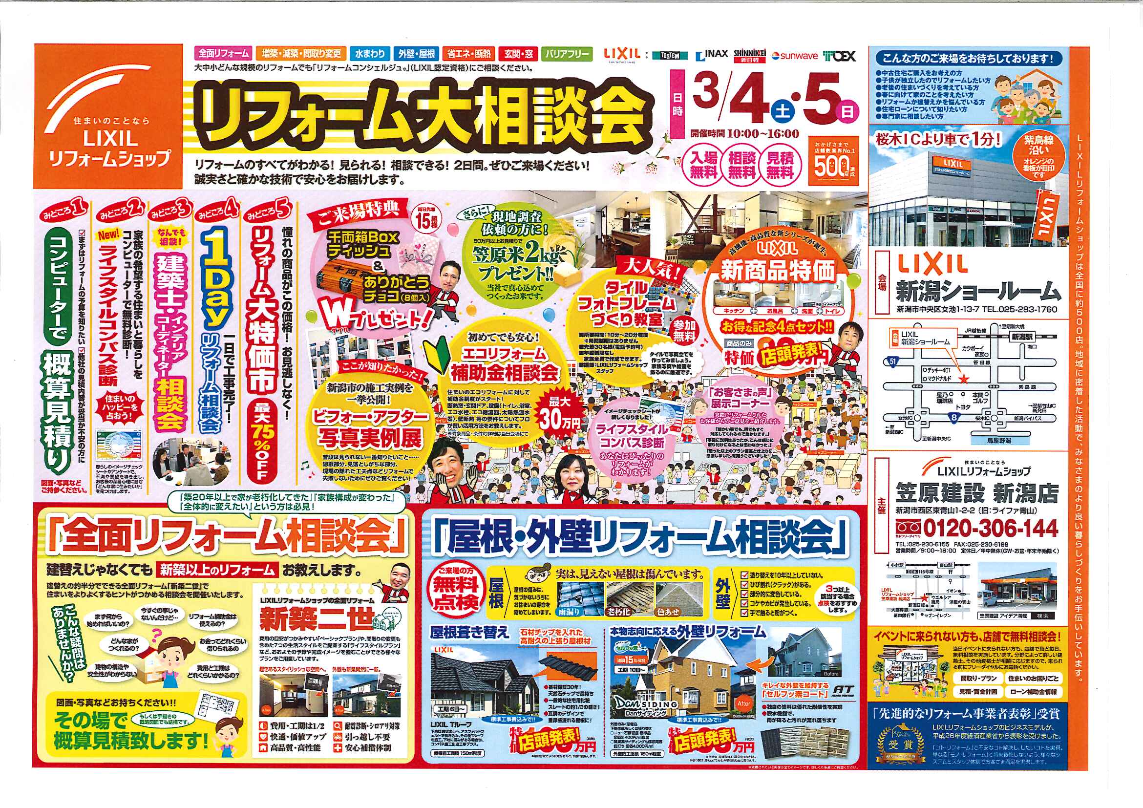 笠原建設新潟店では3月4日(土)・5日(日)の2日間 LIXIL新潟ショールームにて「リフォーム大相談会」を開催致します。 リフォーム特価市や1Dayリフォーム特集など毎回大好評の企画はもちろんのこと、 今回は今年発売のLIXILの新商品の展示をいち早くご覧いただけるうえ、新商品発売記念として 「お得な水まわりの4点セット」もご用意しました! 今だけの超お得な2日間です!この機会にぜひご来場ください。 スタッフ一同心よりお待ちしております。