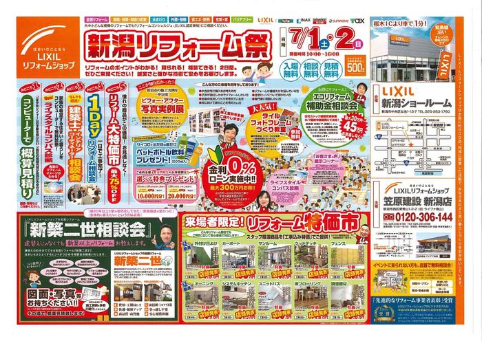 笠原建設 新潟店では下記のとおり「新潟リフォーム祭」を開催致します。 リフォームのポイントがわかる!見られる!相談できる!2日間です。ぜひお気軽にご来場ください。 もちろん 入場無料!相談無料!見積無料!です。