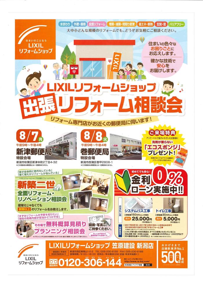 来たる 8/7(月)、8/8(火)の2日間 郵便局にて出張リフォーム相談会を開催致します。 住まいのいろいろなお困りごとに専門スタッフがお応えします。 大中小どんな規模のリフォームでも、 この機会にぜひお気軽にご相談下さい。