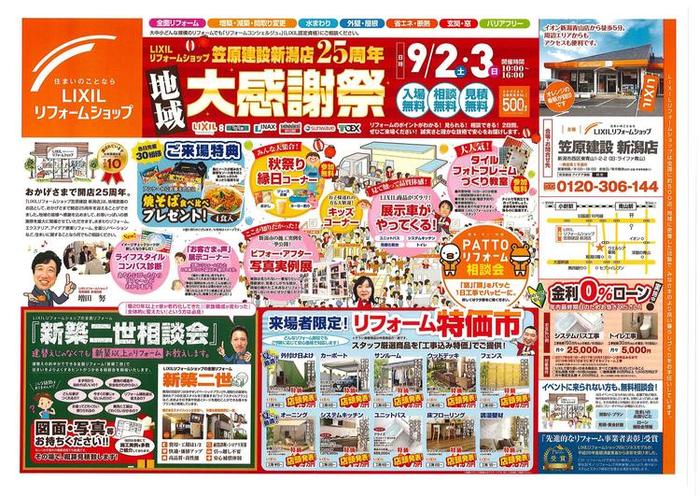LIXILリフォームショップ 笠原建設 新潟店は、地域密着のお店として、 おかげさまで開店25周年を迎えることが出来ました。そこで、地域の皆さまへ感謝を込めまして、お得いっぱいの「大感謝祭」を盛大に開催させていただきます。今回は弊社事務所での開催となります。 ご近所の皆さま、この機会にぜひお気軽にご来場下さい。