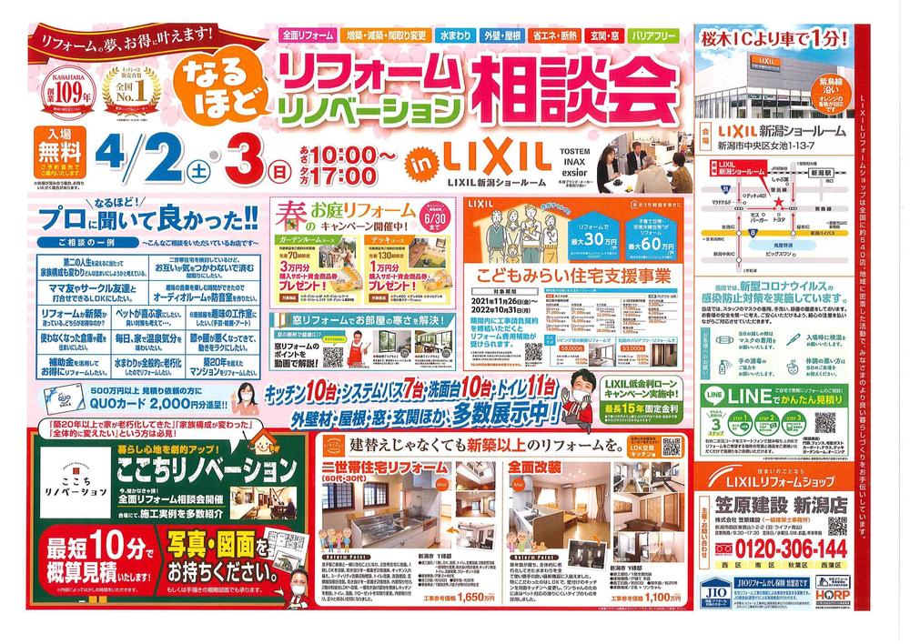 LIXILリフォームショップ 笠原建設 新潟店 では4月2日(土)・3日(日)の2日間