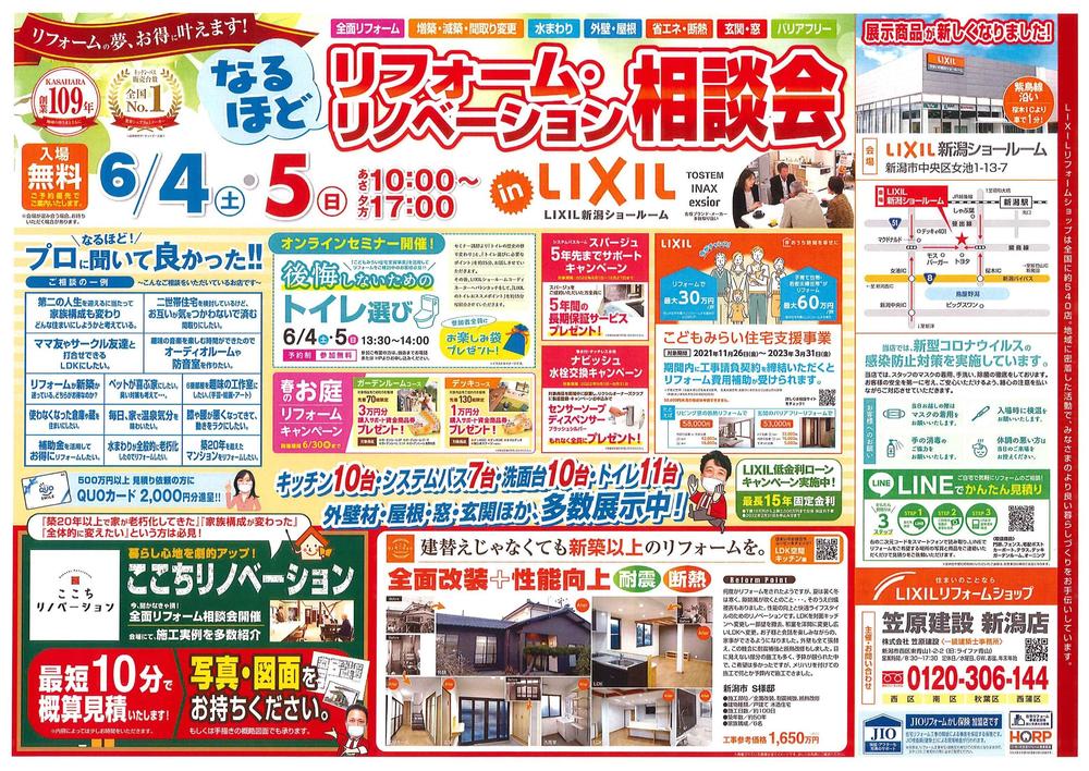 LIXILリフォームショップ 笠原建設 新潟店 では6月4日(土)・5日(日)の2日間