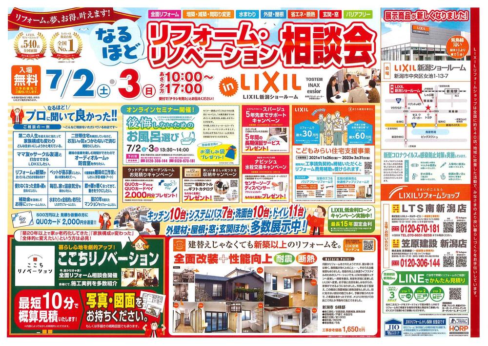 LIXILリフォームショップ 笠原建設 新潟店 では7月2日(土)・3日(日)の2日間