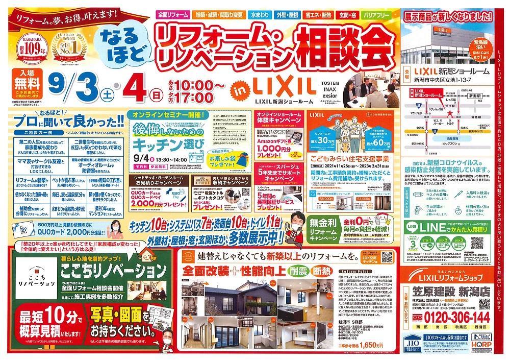 LIXILリフォームショップ 笠原建設 新潟店 では9月3日(土)・4日(日)の2日間