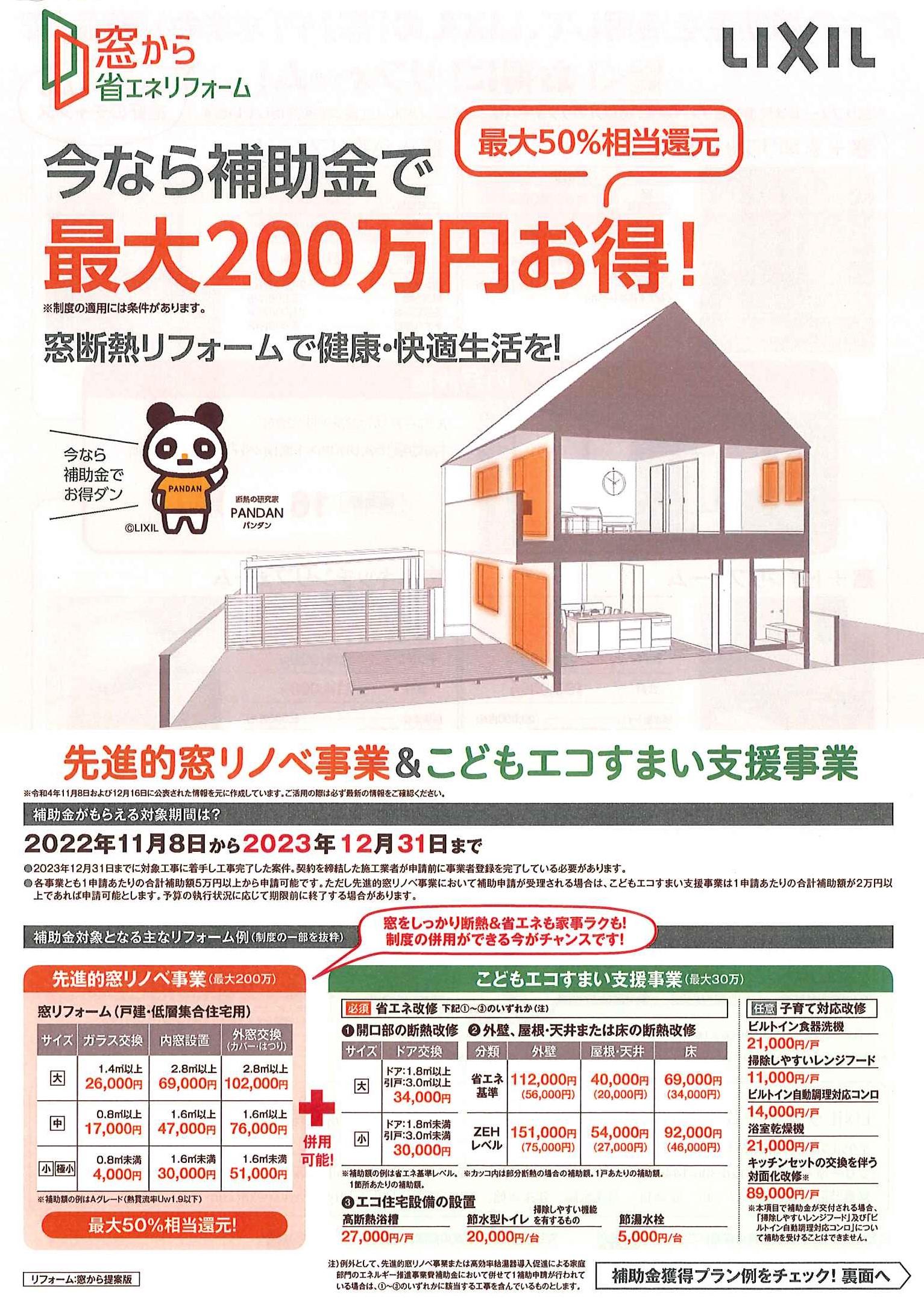 リフォーム‥工事内容に応じて、5万円~200万円/申請(200万円/戸)