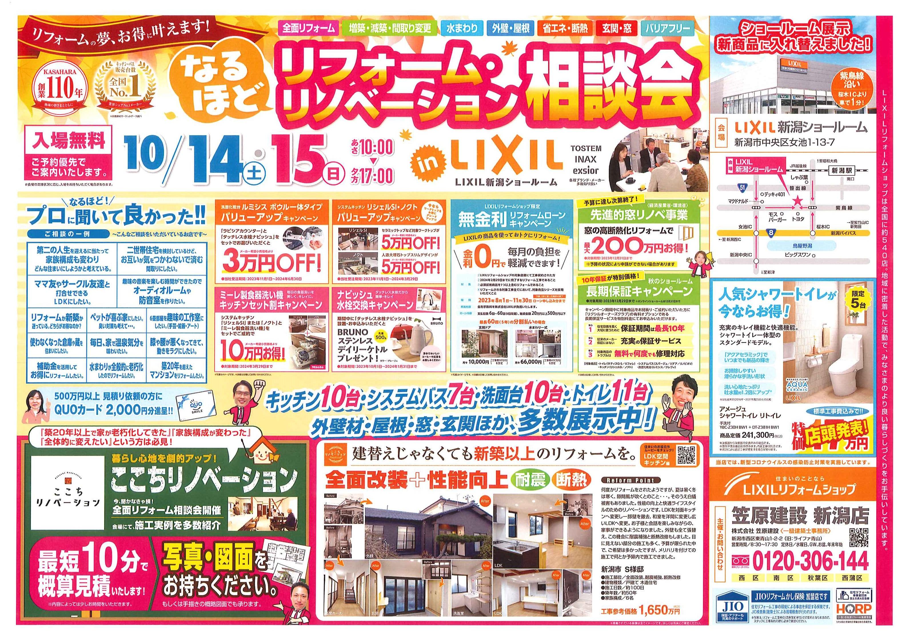LIXILリフォームショップ 笠原建設 新潟店 では10月14日(土)・15日(日)の2日間