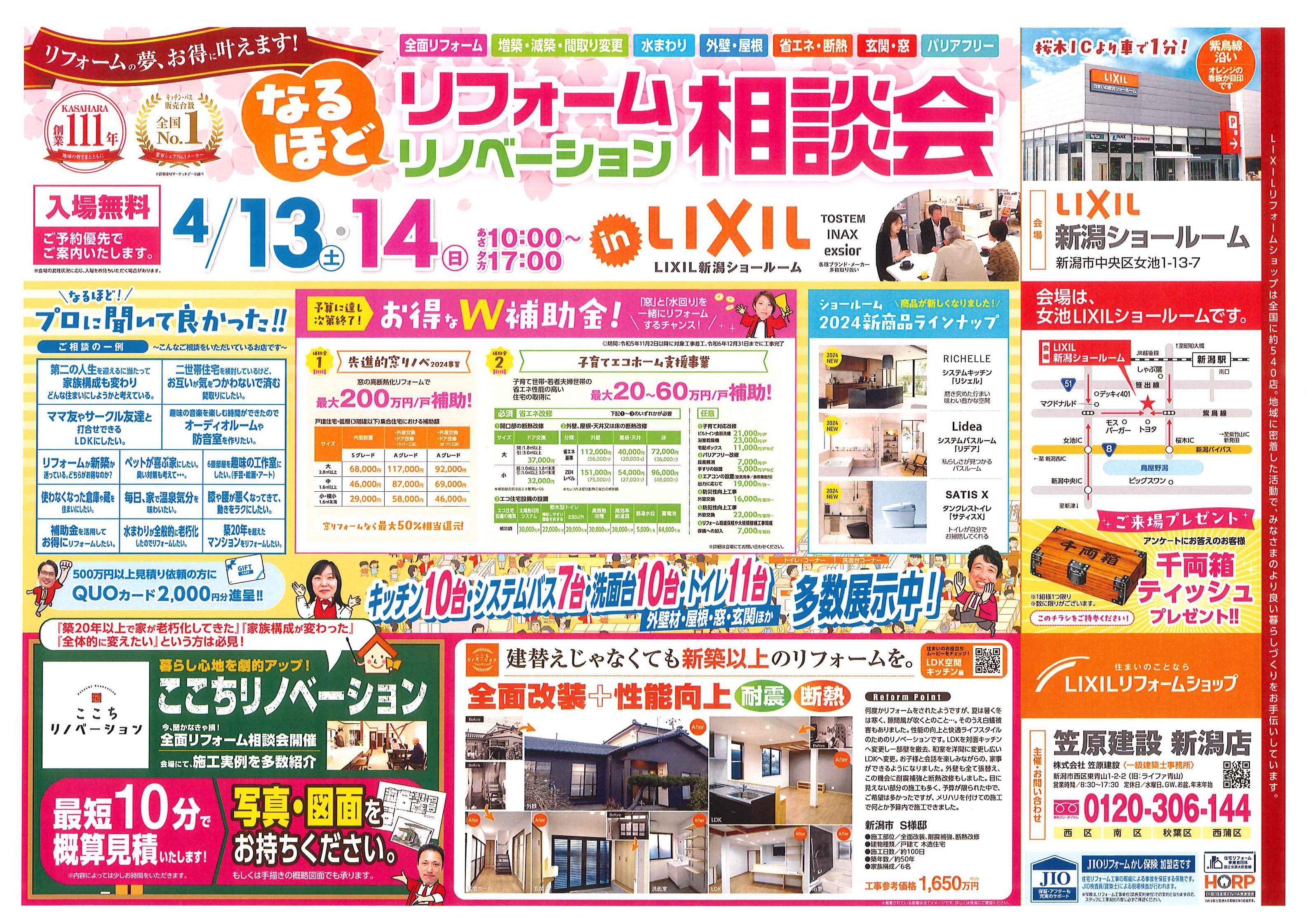 LIXILリフォームショップ 笠原建設 新潟店 では4月13日(土)・14日(日)の2日間