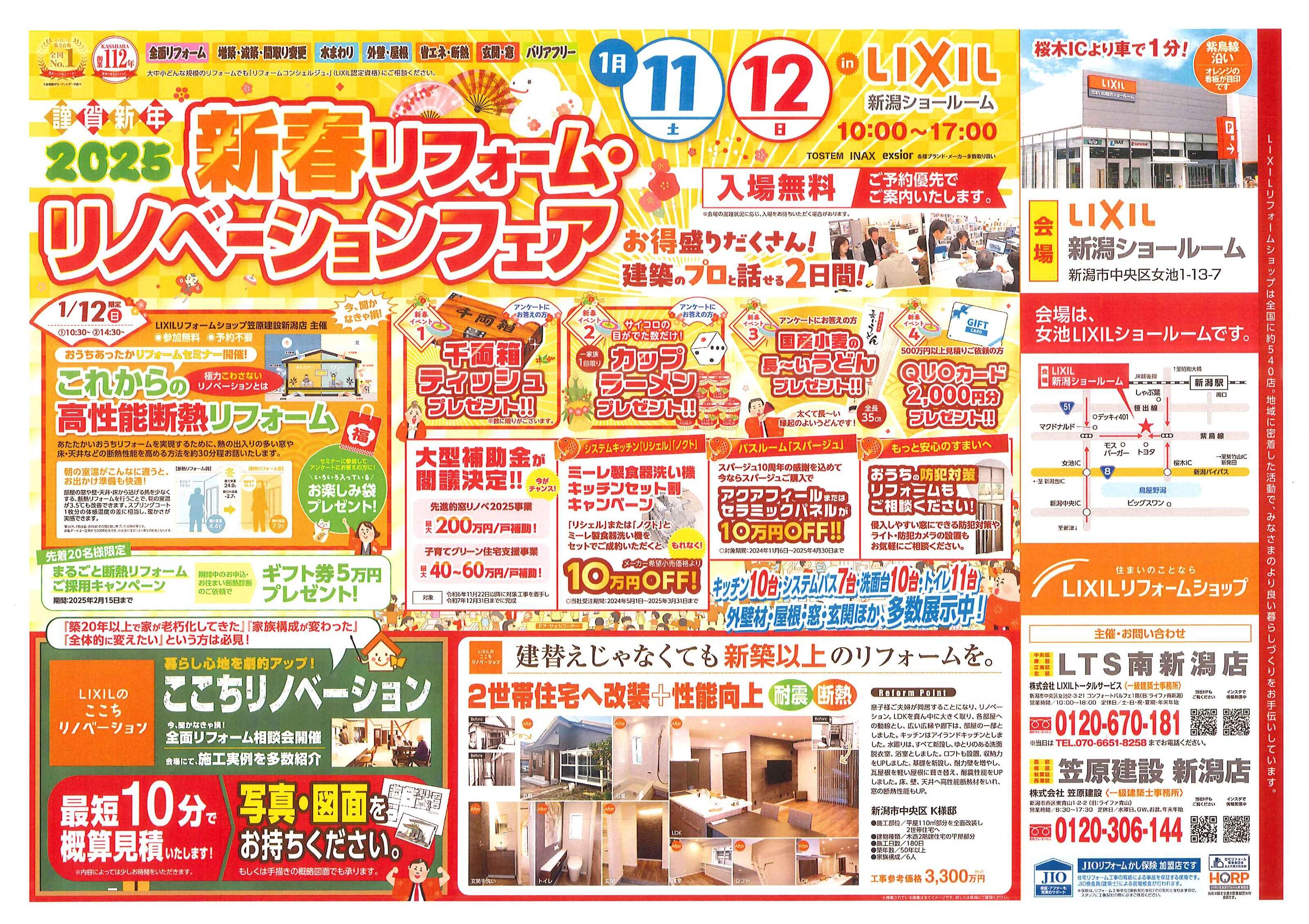 LIXILリフォームショップ 笠原建設 新潟店 では2025年1月11日(土)・12日(日)の2日間