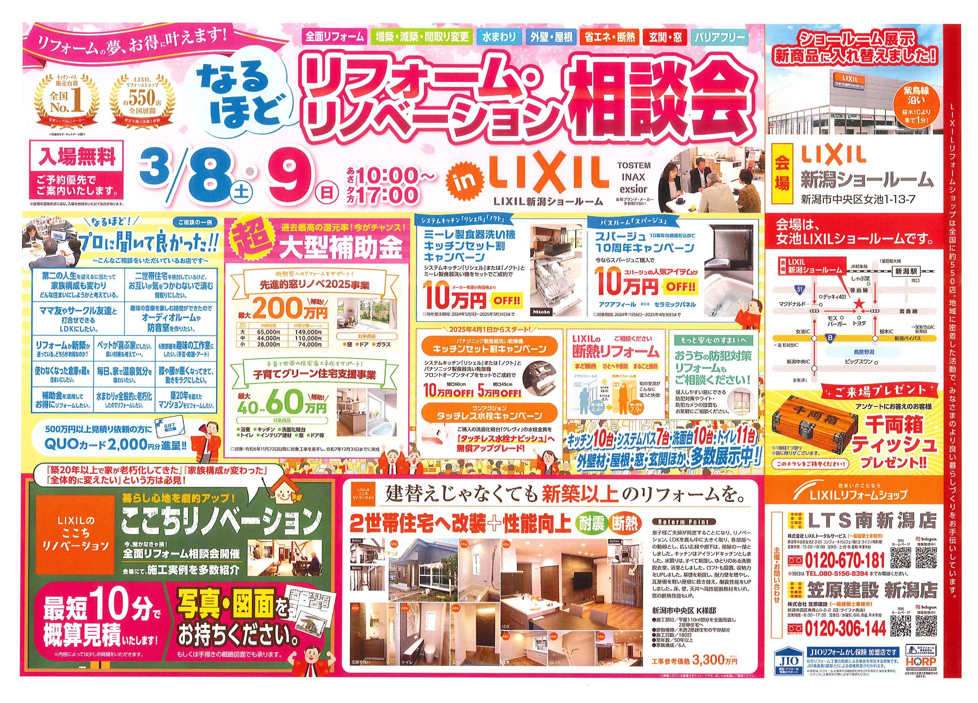 LIXILリフォームショップ 笠原建設 新潟店 では3月8日(土)・9日(日)の2日間