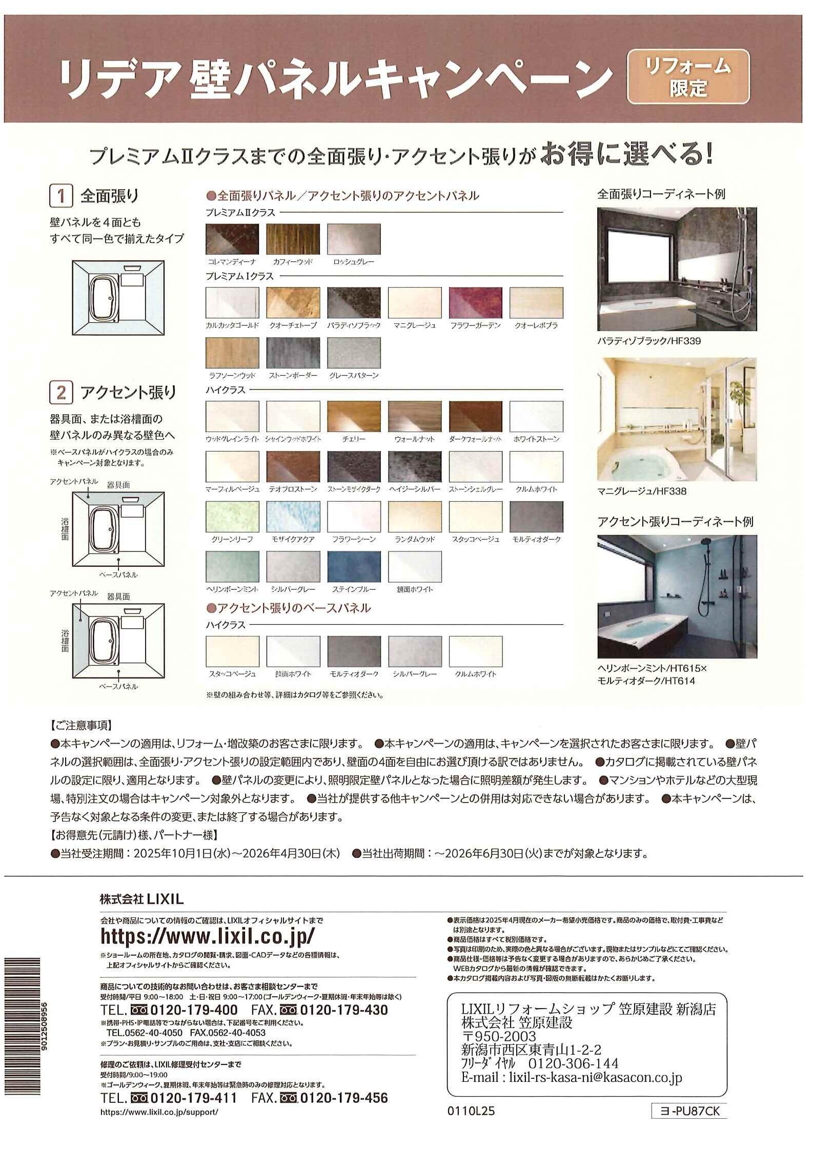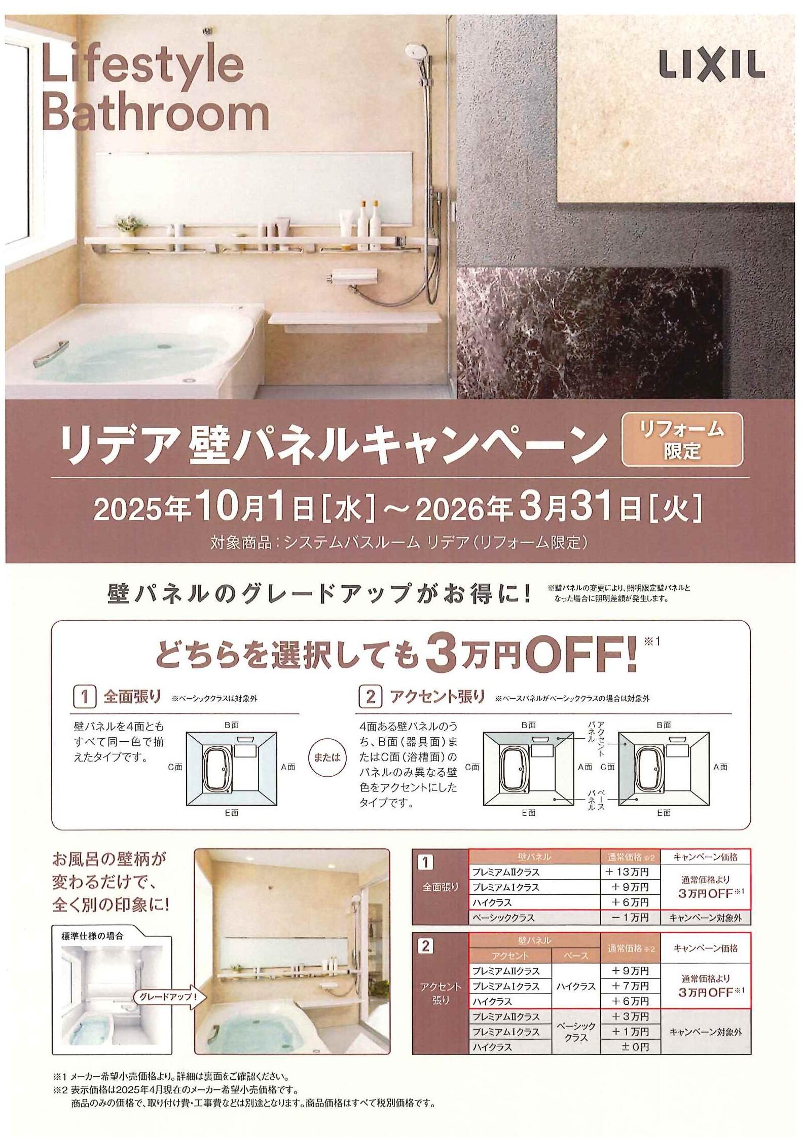リフォーム限定!システムバス「リデア壁パネルキャンペーン」開催中!