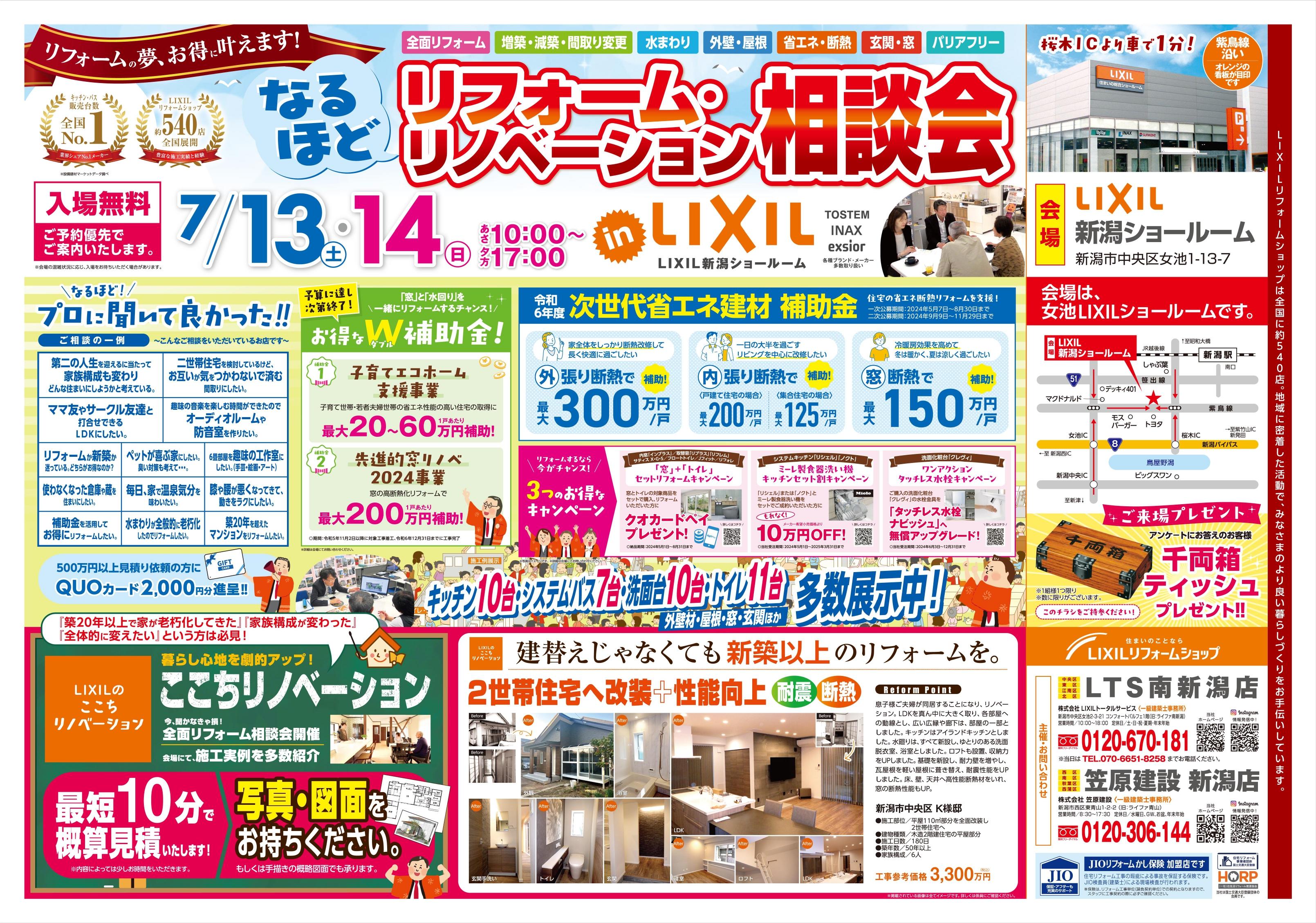 LIXIL新潟ショールーム で7月13日(土)、14日(日)の2日間でリフォームイベント開催する事が決定しました!(*^▽^*)