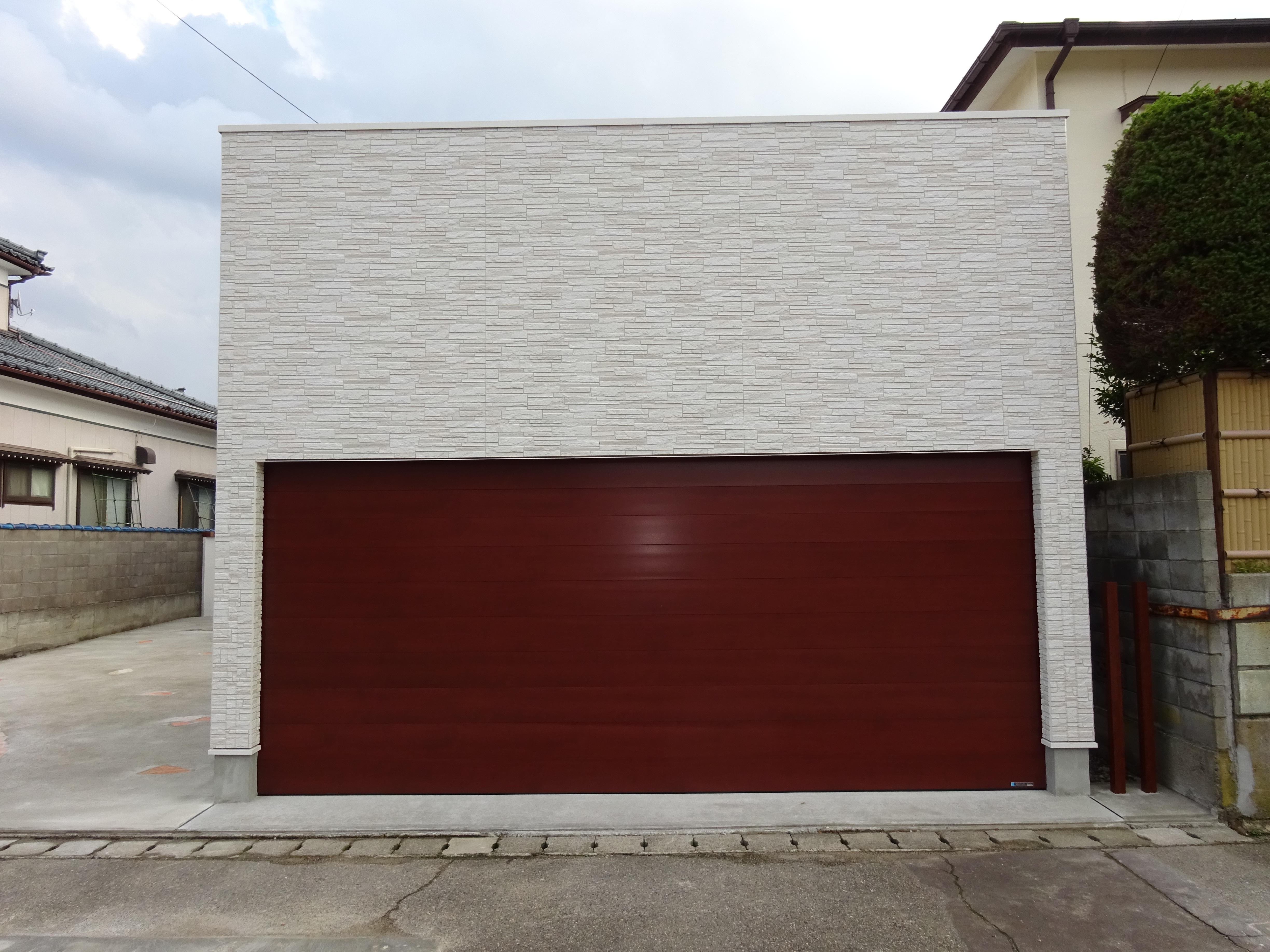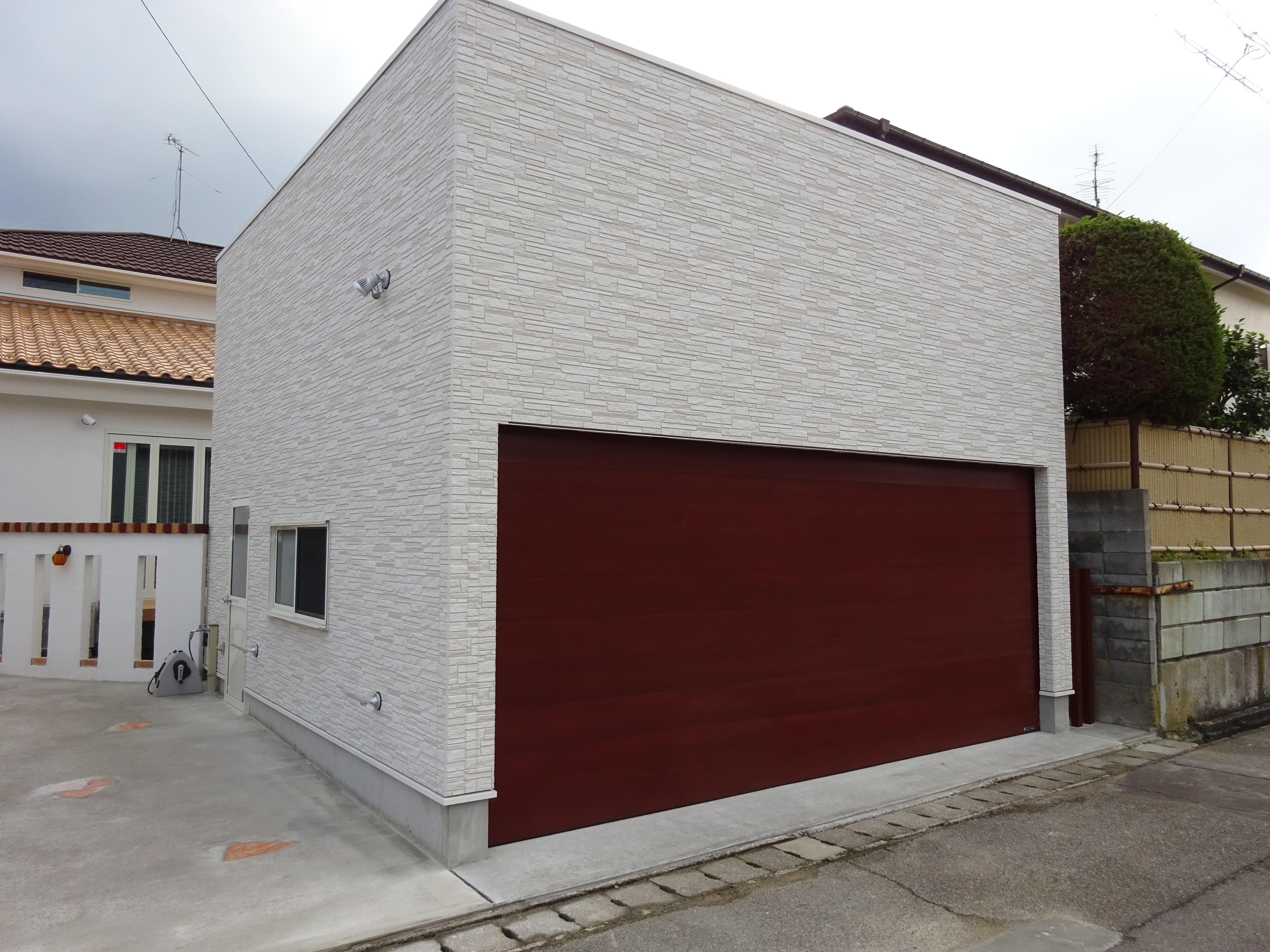 今までお使いの車庫を全面改装に伴い、作り変えました。木目の電動オーバースライダーはリモコン操作で簡単に開け閉め可能