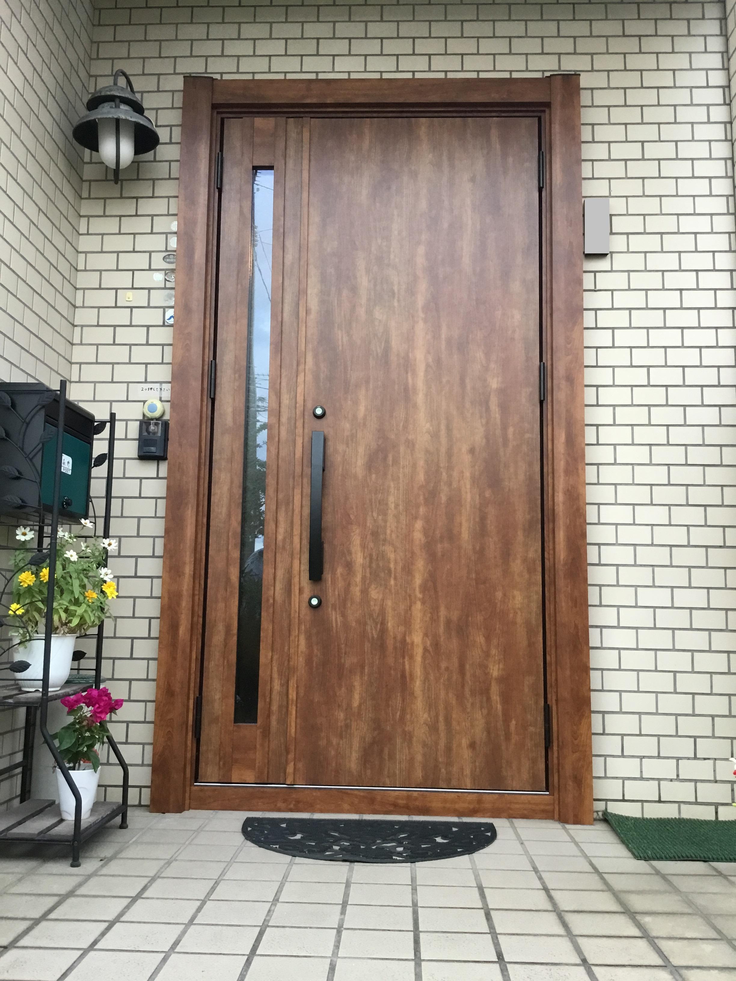 玄関ドアの交換をLIXILの【リシェント】を使用して施工させて頂きました。リシェントを使用すれば工事も一日で完了します。デザインも木目調の物や採風機能があるものなど様々あります。