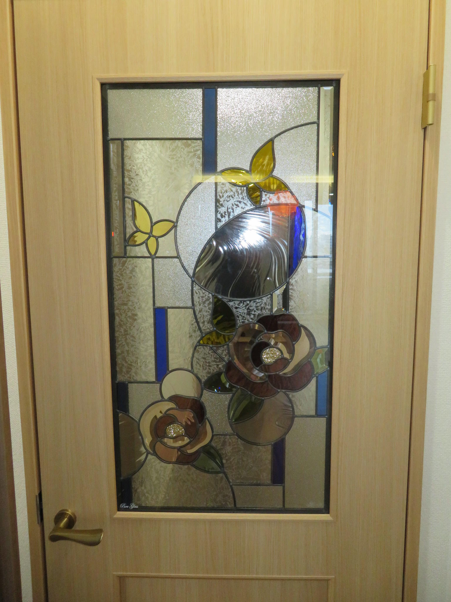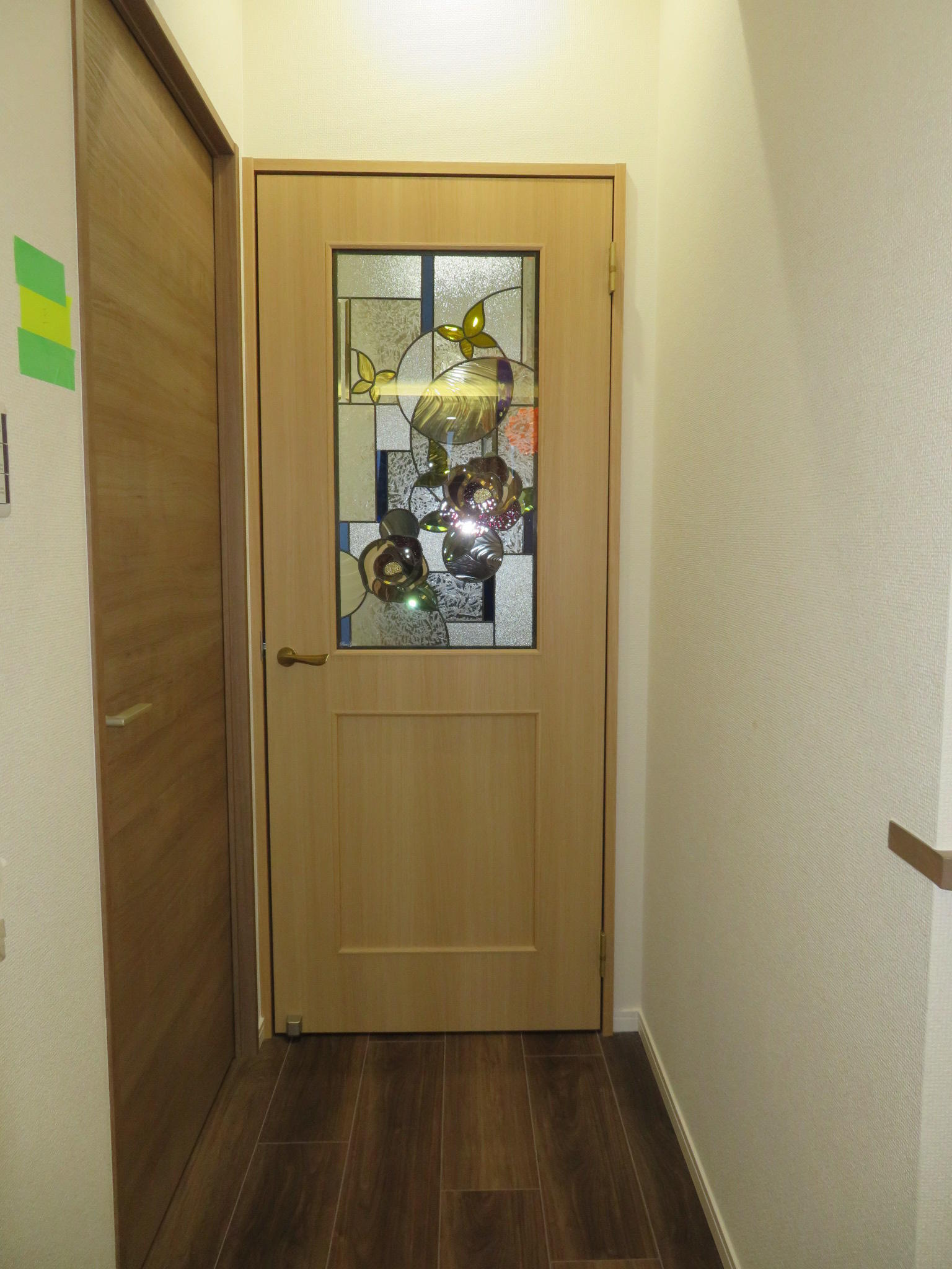 リビングドアは玄関からまず目に入る部分にお花柄のステンドグラス仕様建具へ交換。この建具は現在放映中のTVドラマの中で採用されているステンドグラス。奥様の一番のお気に入りです。