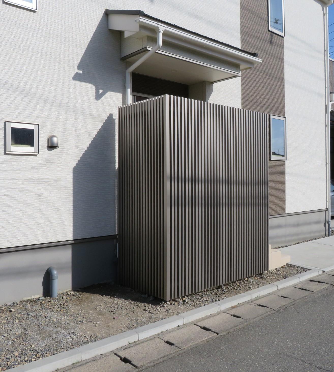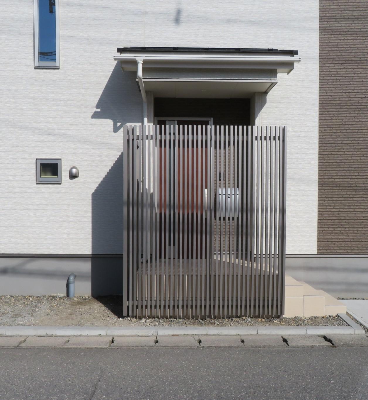 建売物件を購入したが、玄関前の道路からの視線が気になる点と玄関階段2段部分のみタイルを張りたいと問い合わせを頂く。 まったく玄関を隠してしまうと圧迫感が出ると思いセミクローズになるコートラインを提案。 アルミ柱はサッシ同色のシャイングレーにしスタイリッシュな風合いになりました。 お施主様も風除室よりコートラインし素敵な玄関まわりになり大変喜んで頂きました。