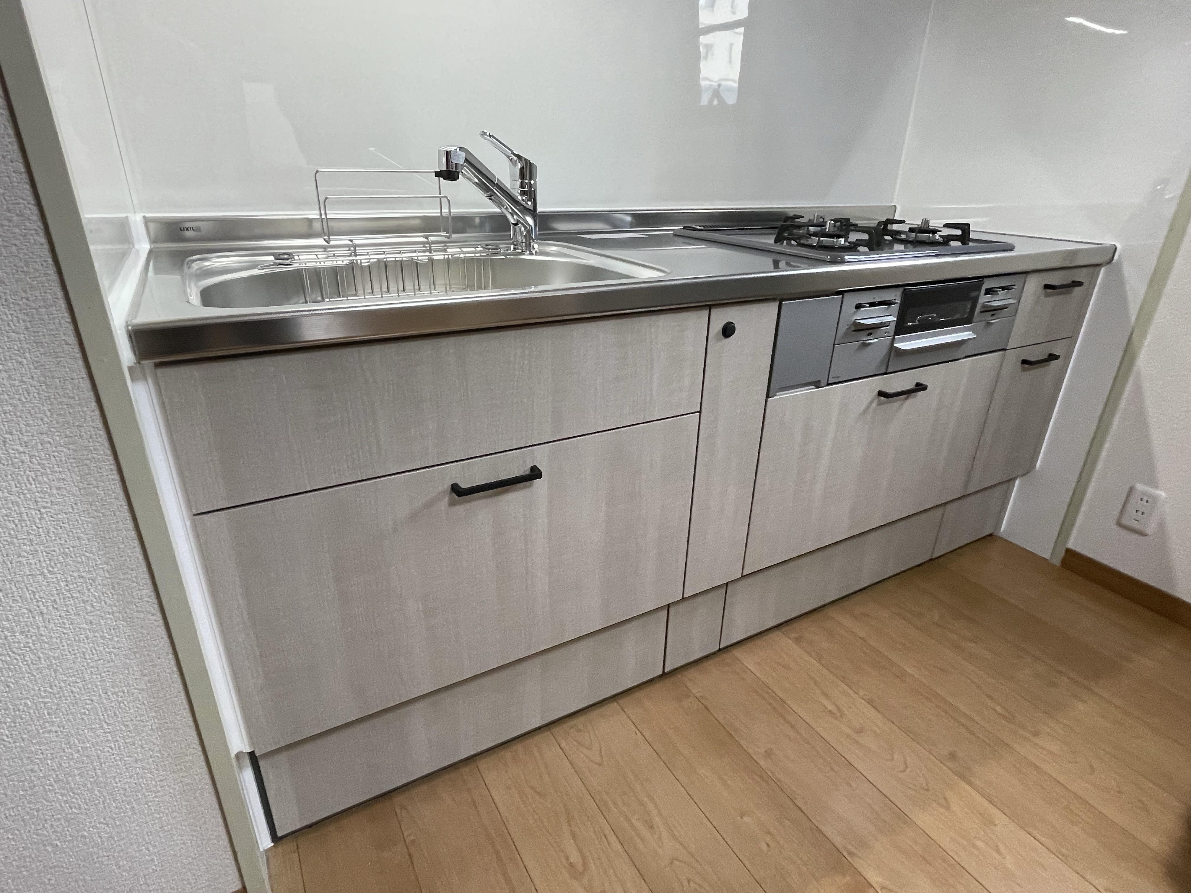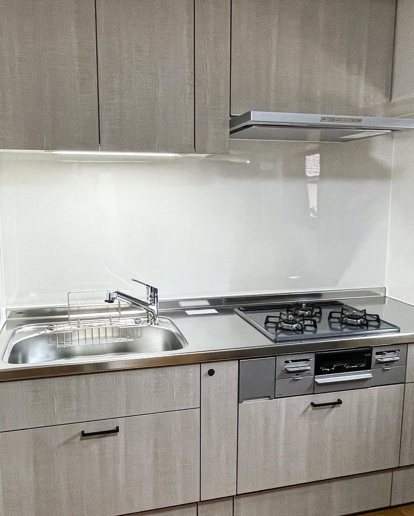 マンションのキッチン入替工事を行いました。 レンジフードやガスコンロなど最新のものは便利機能が多いだけでなくお手入れも楽々です、壁もタイルからキッチンパネルにする事でお掃除が簡単になりました。