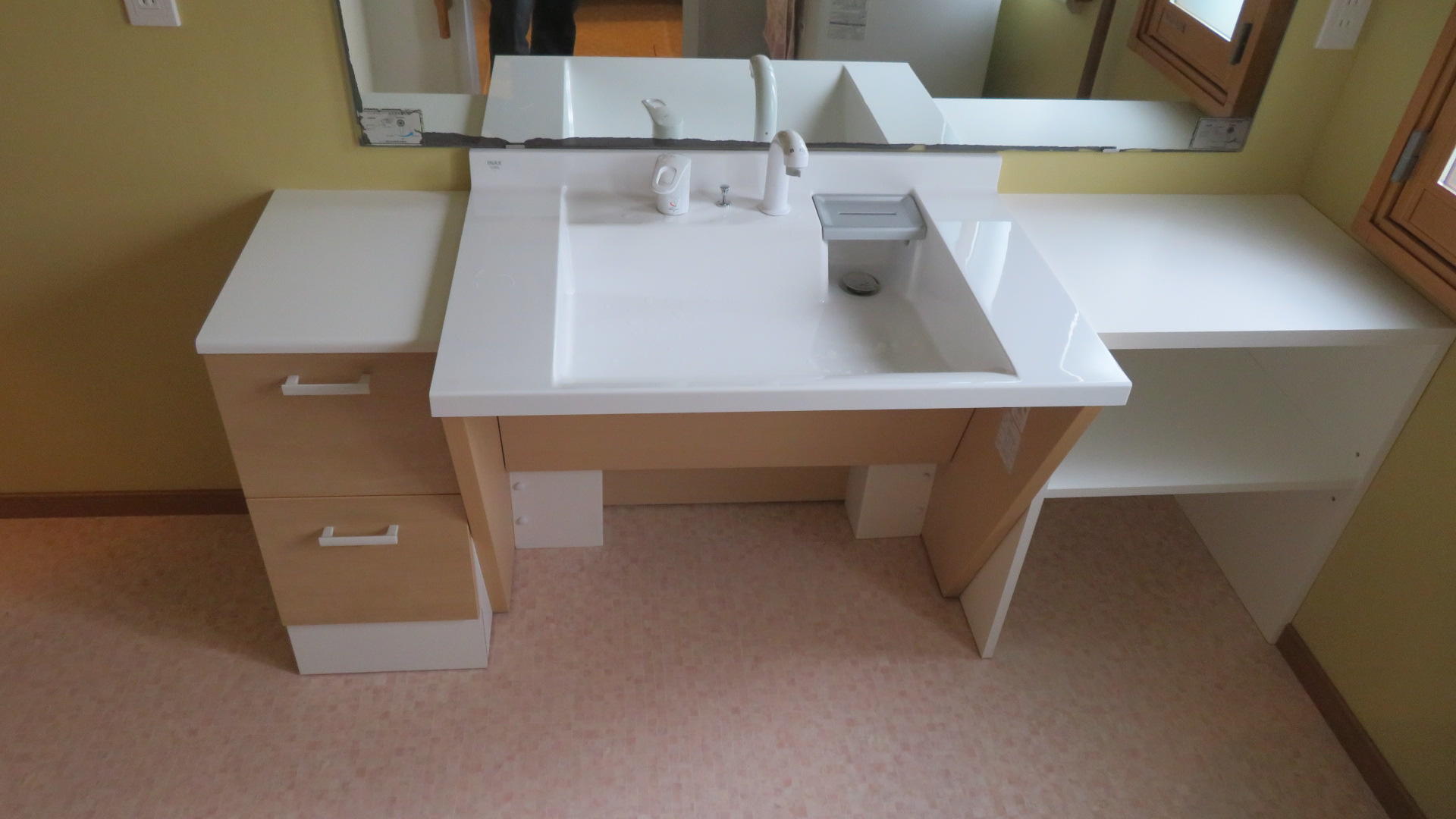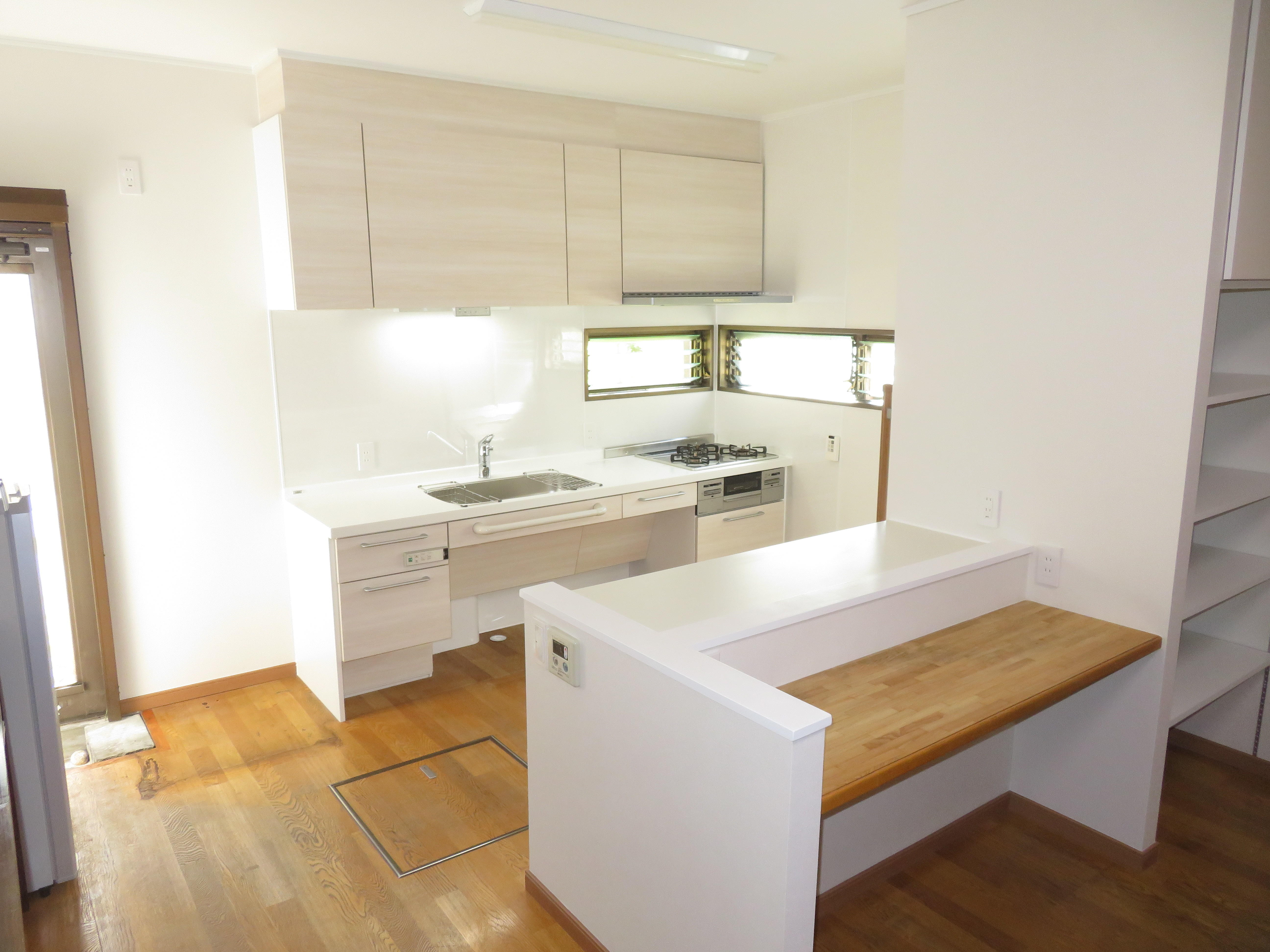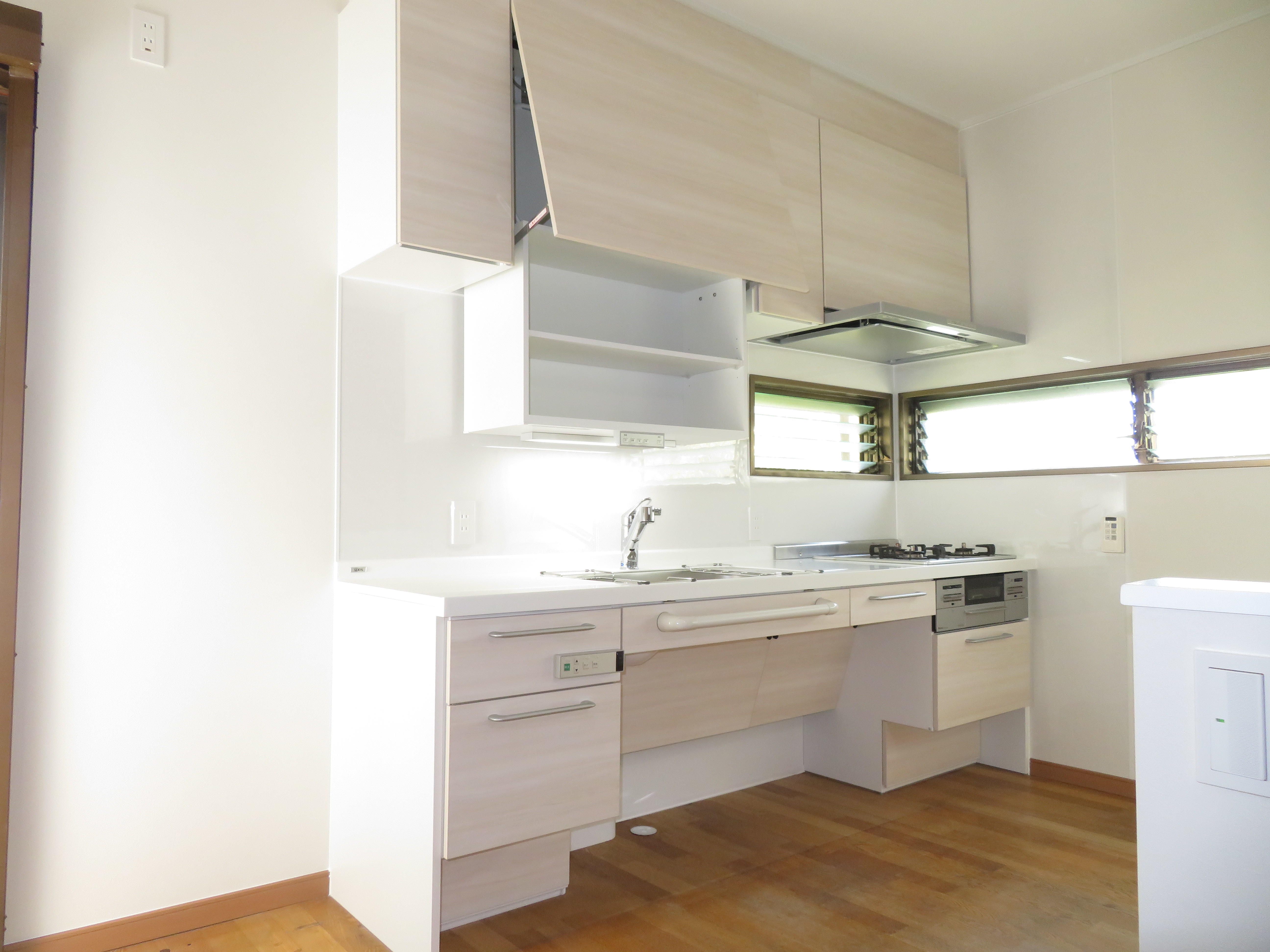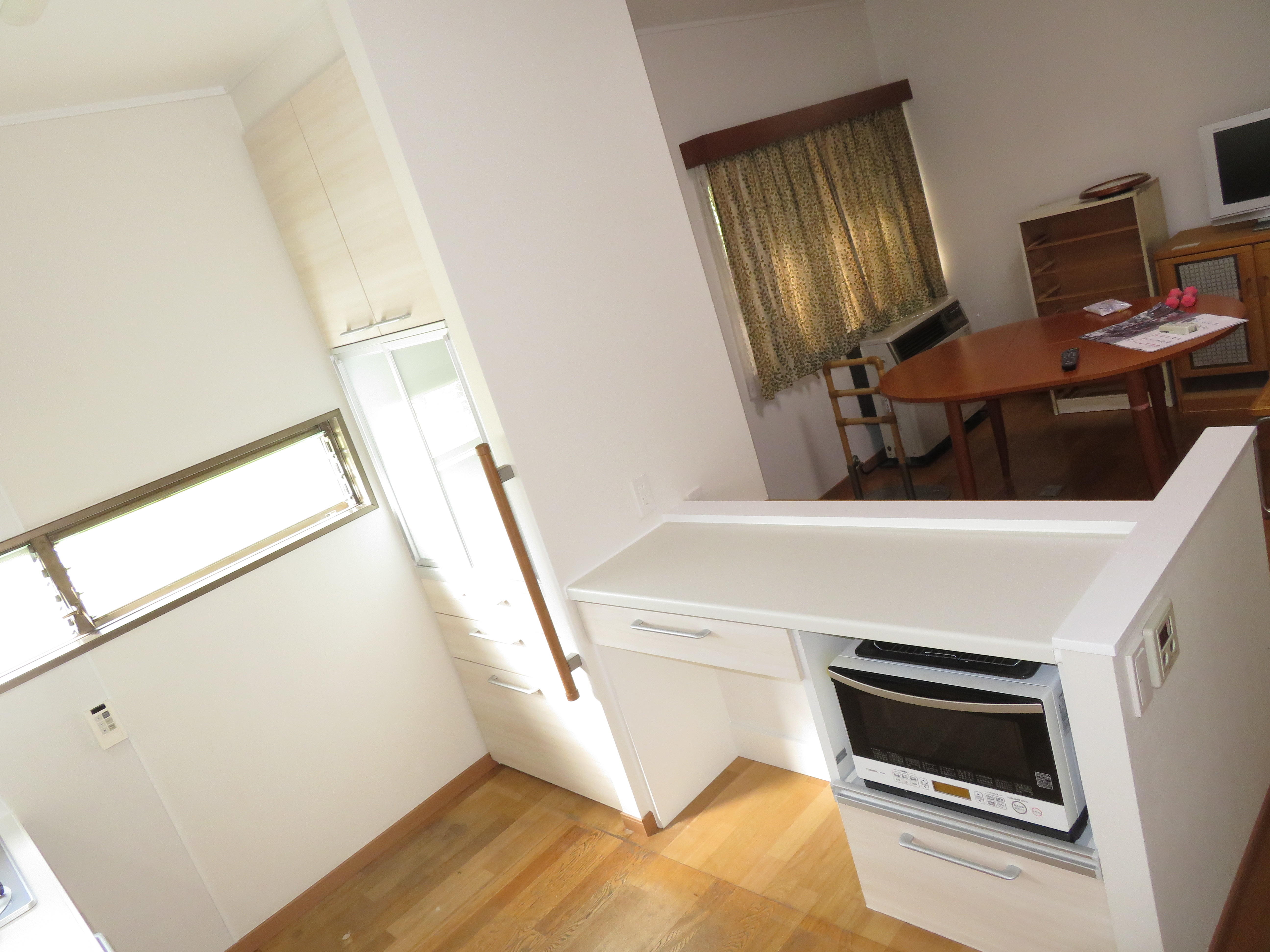 今回は遠方にお住いの娘様からご実家で車椅子で生活しておられるお母様が使いやすいキッチン・洗面・ユニットバス改装のご相談を頂きました。今回の改装工事はいかにお母さまの動線を効率よくできるかがとても苦慮しました。限られた予算の中でいかに車椅子での使用しやすくまた、安全性を考え設計しました。採用頂いた住宅設備機器はキッチンはLIXIL車椅子対応キッチンウエルライフ・洗面化粧台はLIXILドゥケアカウンター・浴室はLIXIL スパージュCZ。予算内で納められるように既存収納を利用し既存収納にカウンターを伸ばしゴミ箱スペースの確保。お母さまの動線には必要個所に手摺設置、リビング・洗面入口既存開き戸を引き戸へ変更し安全性を考慮しました。打合せは遠方にお住いの娘様が新潟に来られる機会も限られる為、住宅設備機器打合せにはLIXILオンラインショールームでZOOM打合せができました。このシステムを活用できたことで密な打合せを繰り返すことができ遠方の娘様からも大変喜んで頂きました。お母さまからはこのリフォームで今までキッチン・洗面化粧台の高さが丁度よく、使い易くなり大変喜んでい頂きました。