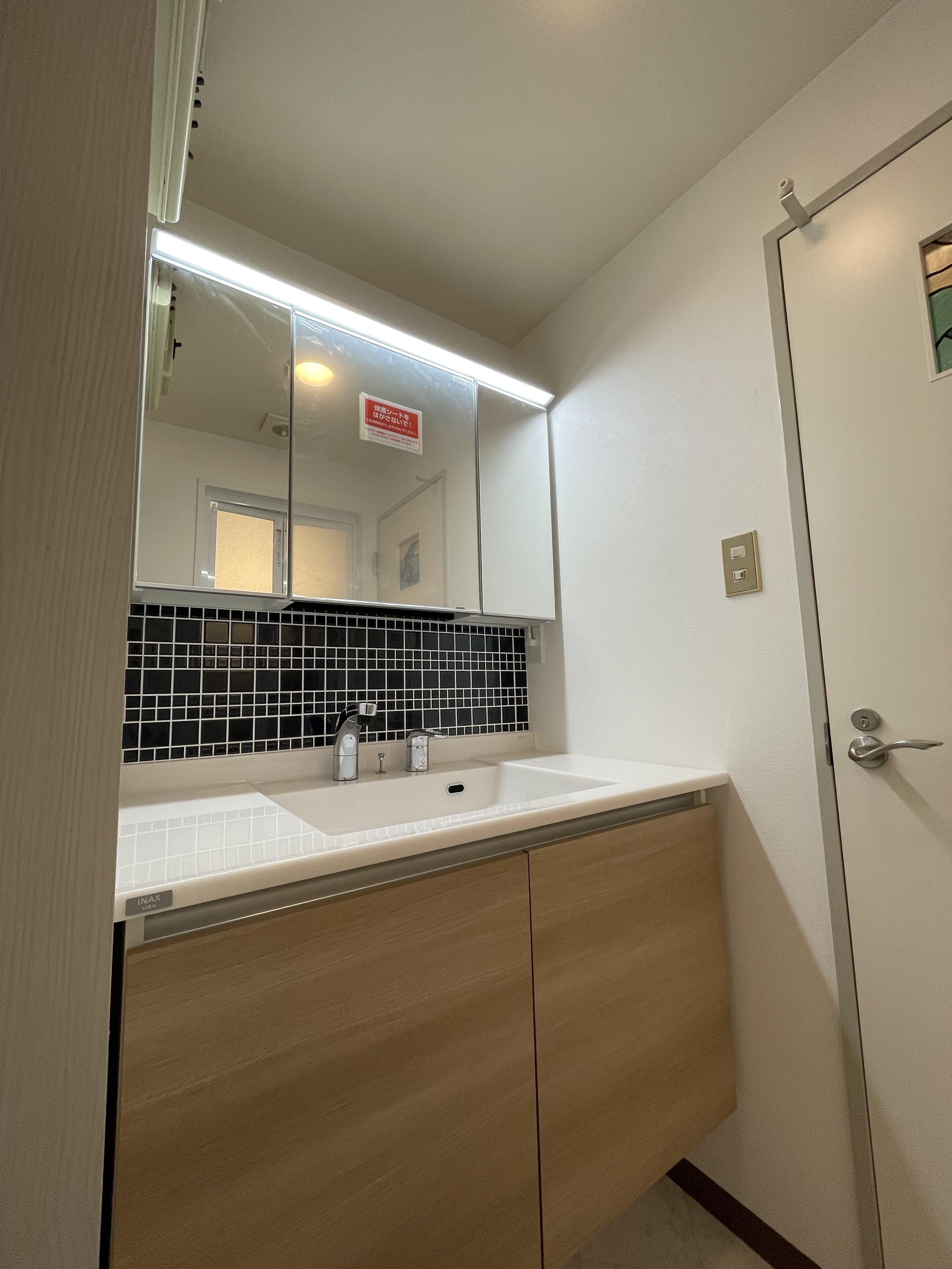 水廻りの工事を行いました。その中でもこだわった洗面化粧台では【ルミシス】をご採用頂き、カウンターや扉の色だけでなくボウルと鏡の間にお気に入りのタイルを貼りました。毎日使う場所で気分を上げてくれる化粧台になりました。