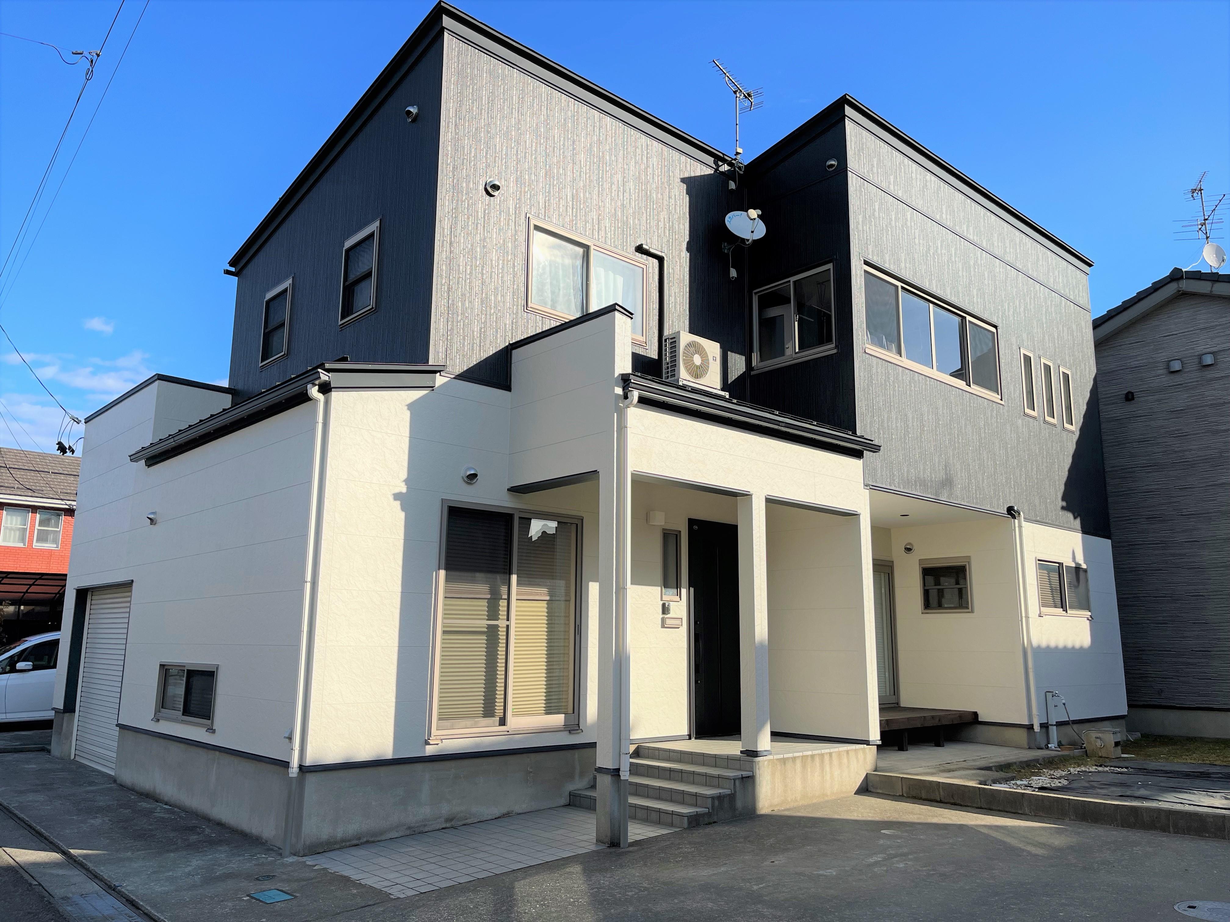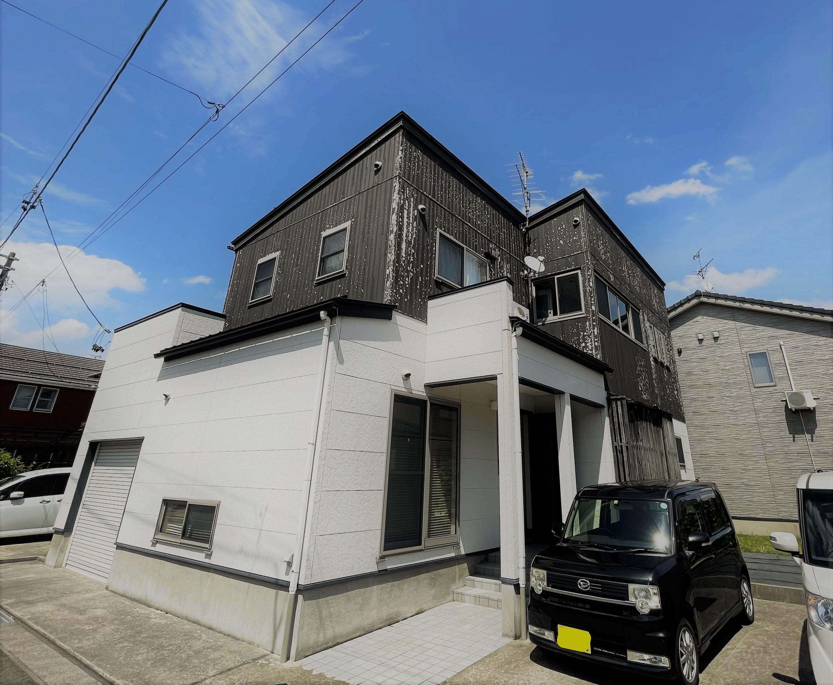 外壁の張替え工事をさせて頂きました。元の外壁がかなり劣化しており一部雨漏れの痕跡もあったため張替えでの工事を行いました。 1階の外壁は塗装工事をし、見た目ががらりと変わりました。