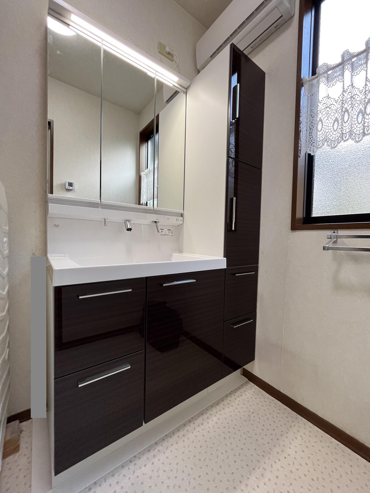 洗面化粧台の交換工事をさせていただきました。 化粧台の大きさは同じですが収納棚と組み合わせることで同じスペースの中で収納力がアップしました。 水栓もお手入れがしやすいものです。