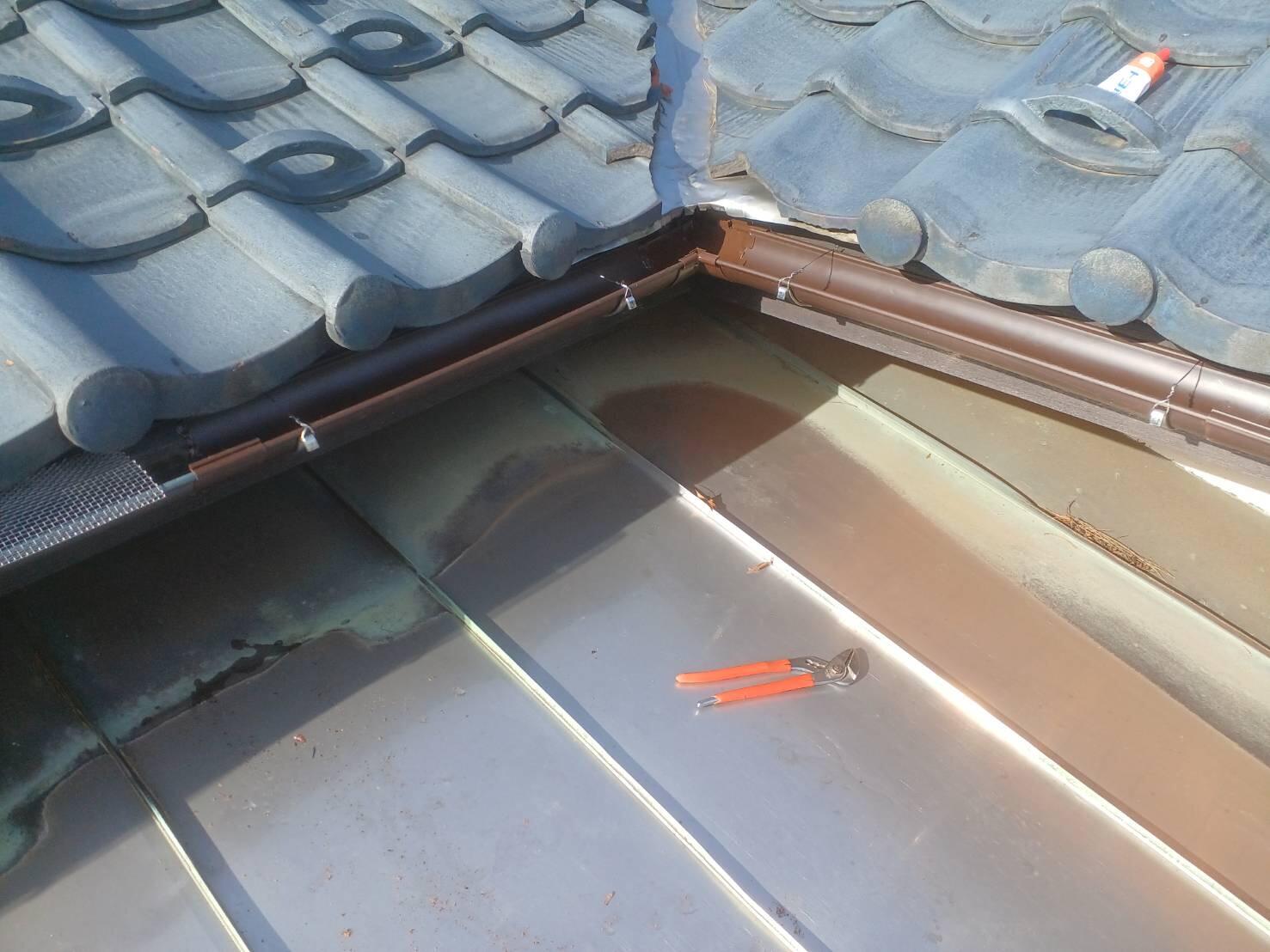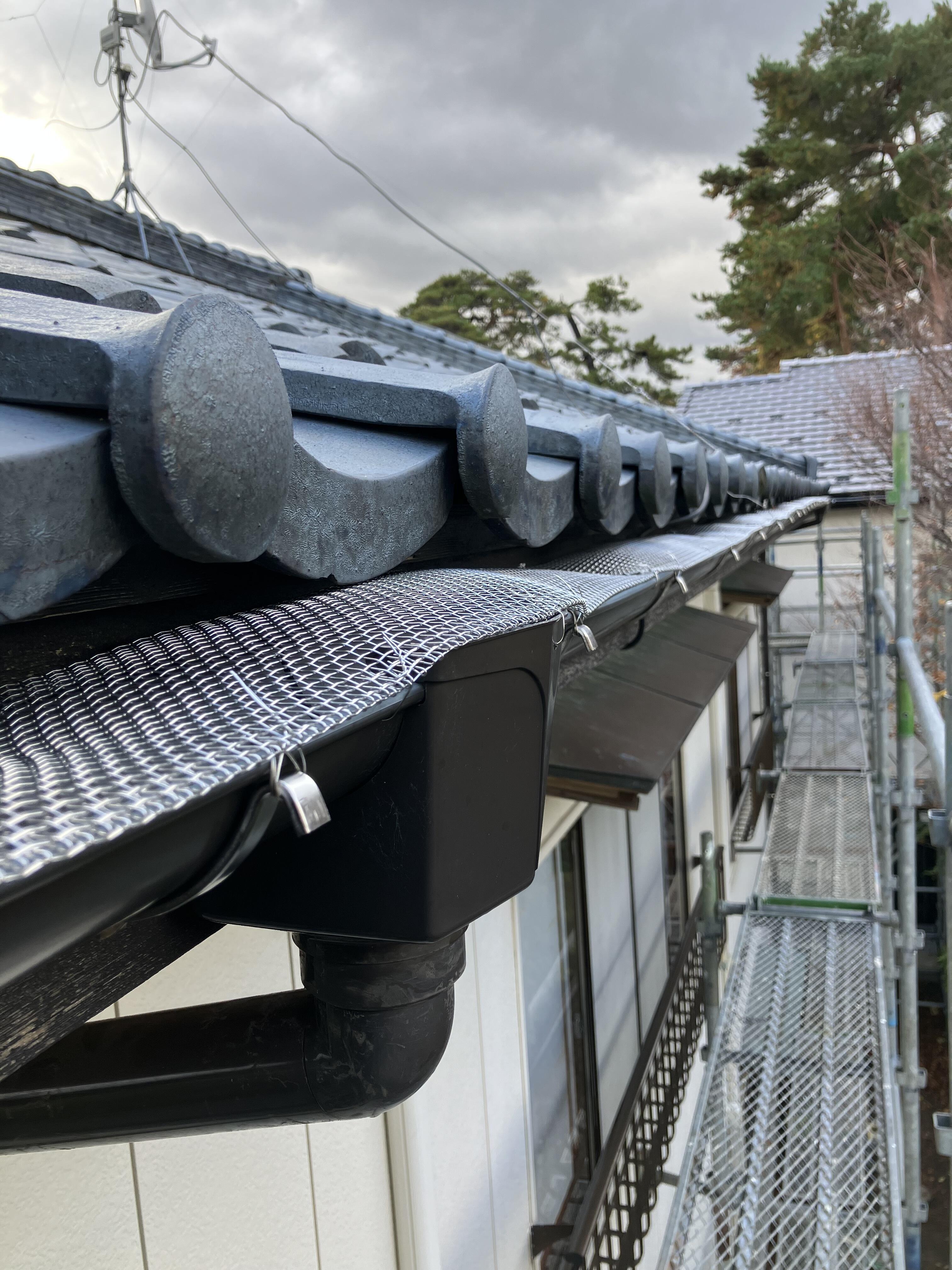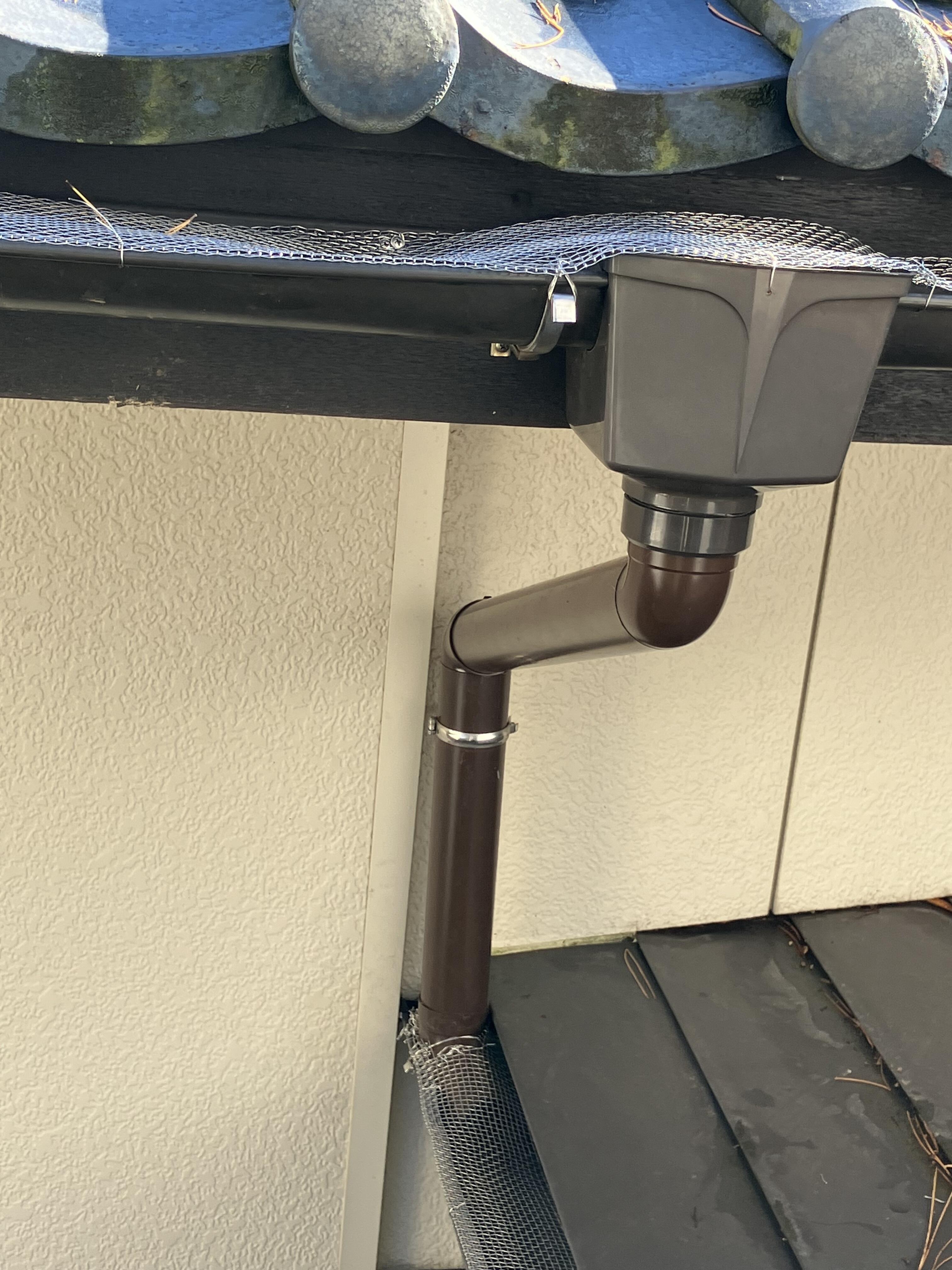 庭木の落葉が雨樋につまり、雨樋としての役目を果たす事ができず、場所によっては集水器に落葉や土がつまり雨水が溢れる箇所がありました。 雨樋や集水器のつまり解消のためのお掃除と細かなネットカバーの取付をご提案させていただきました。