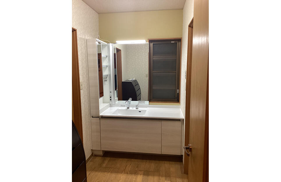 泡クッション機能など機能性を重視したご提案。物の出し入れのしやすさを重視するご提案。洗面化粧台の天板をメラミン化粧板にし、広い洗面ボウルをご提案。 造作洗面化粧台はどのように取付されていているのかを理解し、当初のご要望から、残したいところを綺麗に撤去する事ができるのかどうかを考えました。 全て綺麗にされたいというご要望に変更されて、収納力UPできるルミシスをご提案しました。ご提案させていただいた中で一番喜んでいただけたと思います。