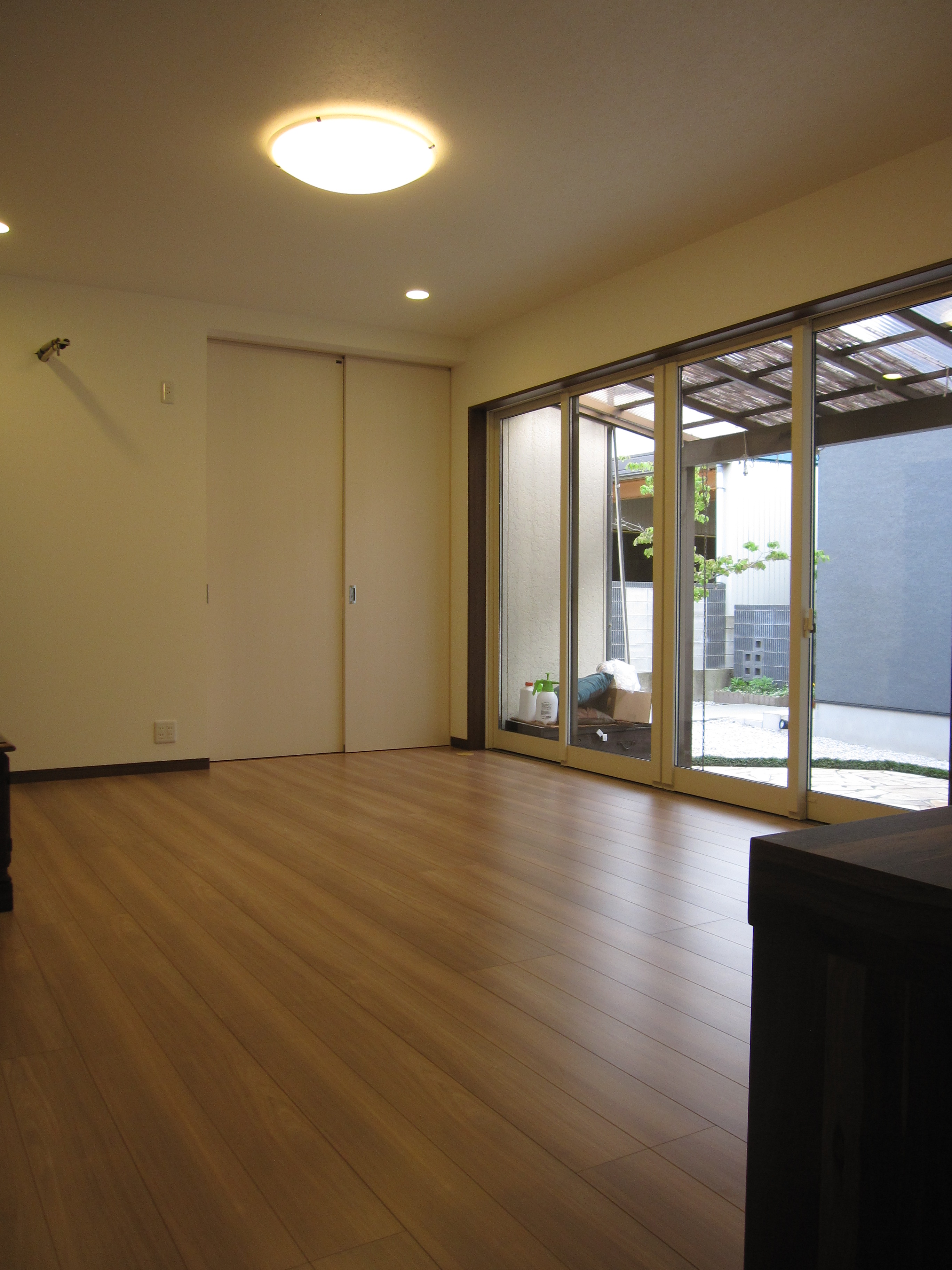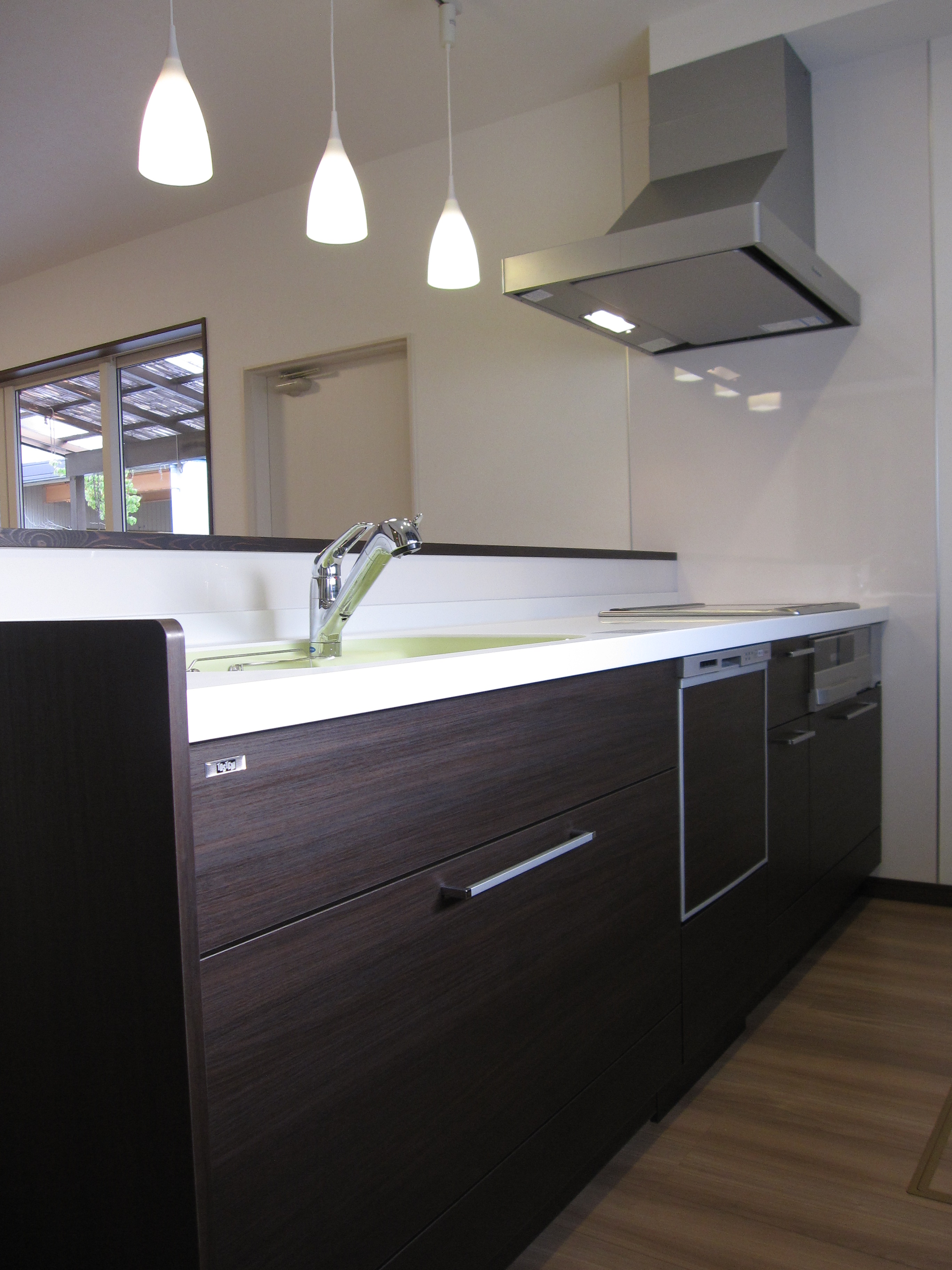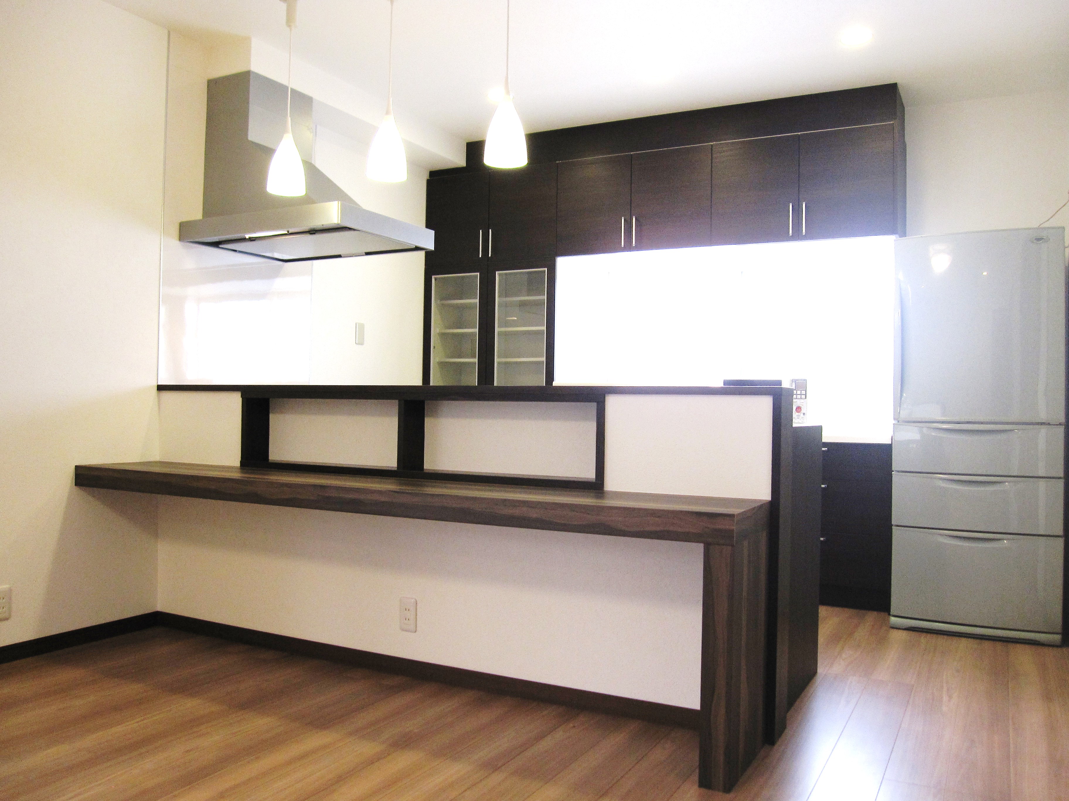 全体的にこげ茶や白を基調とし、モダンでスタイリッシュな空間になりました。リビング横のテラスは、用途に合わせてたくさん活躍しそうです。