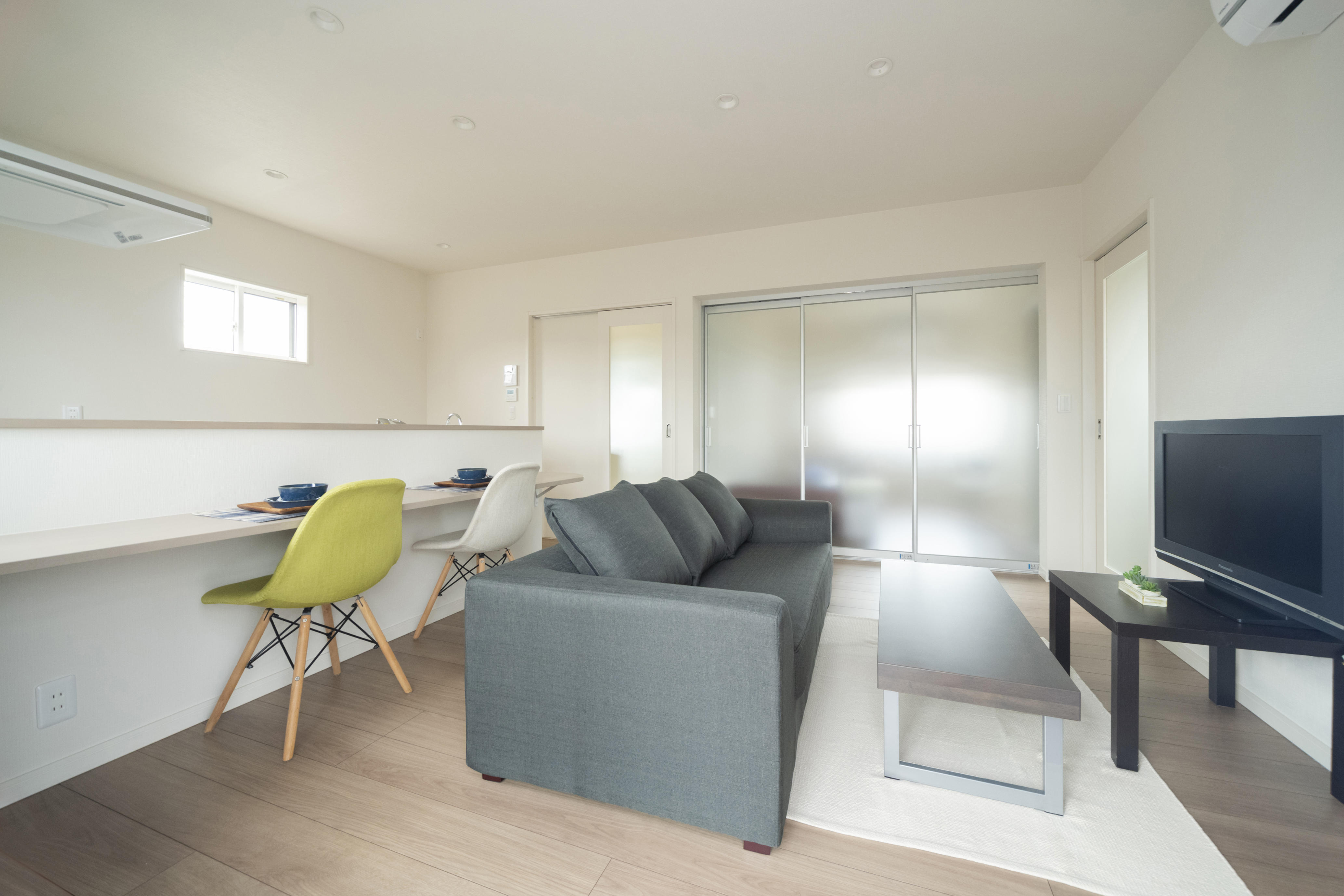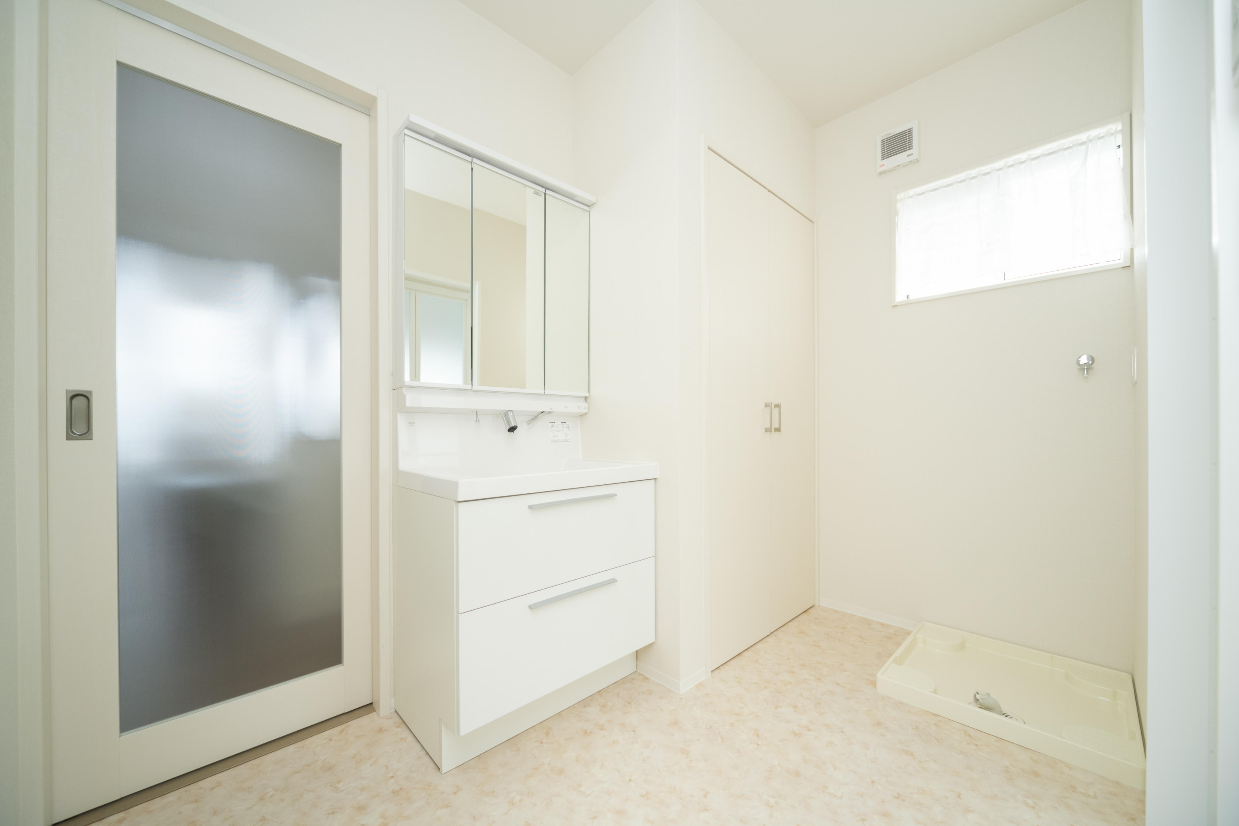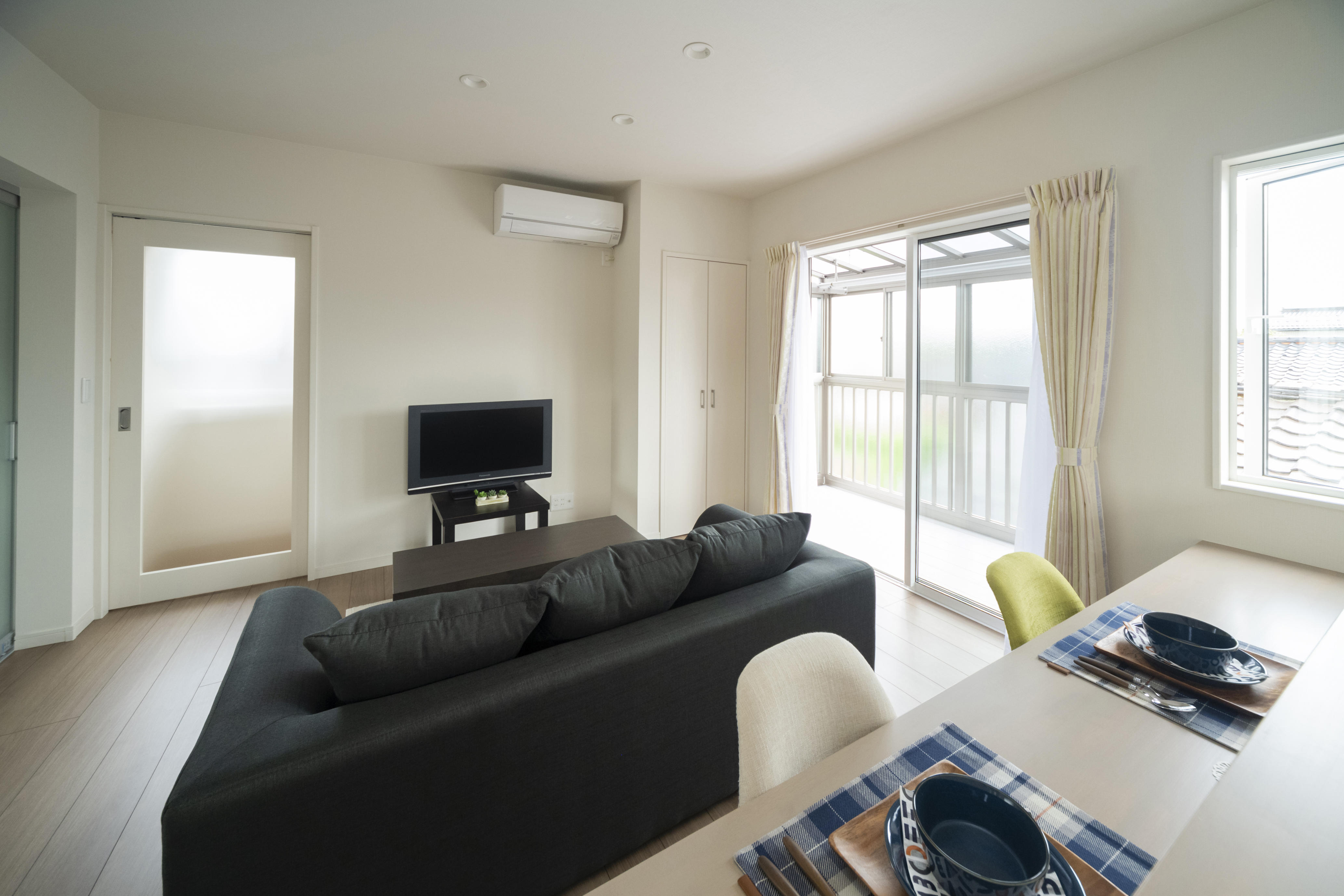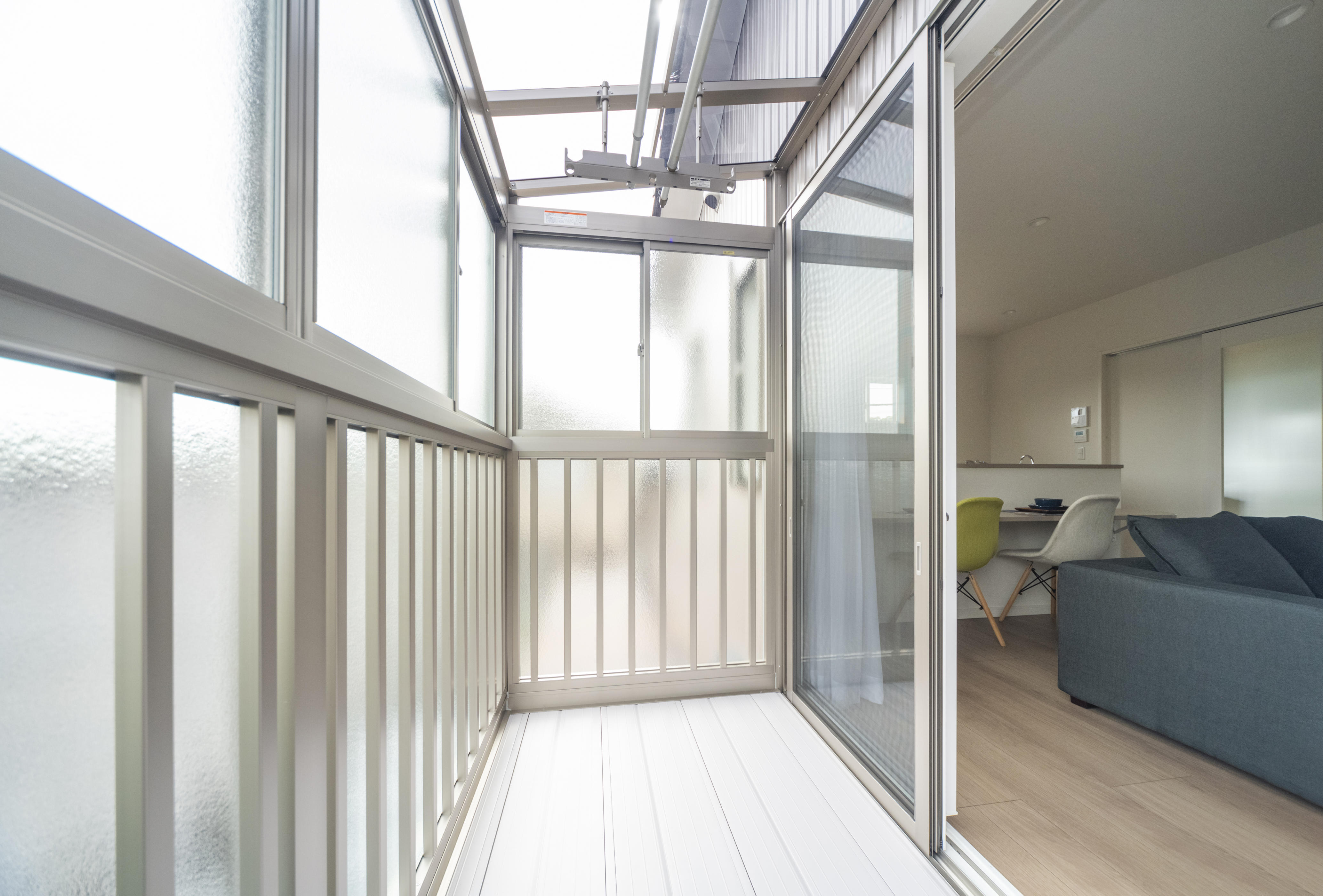 広々とした空間に、洗濯物を干せるサンルーム。プライバシーを守る窓ガラスになっており、気兼ねなく洗濯物を干せます。