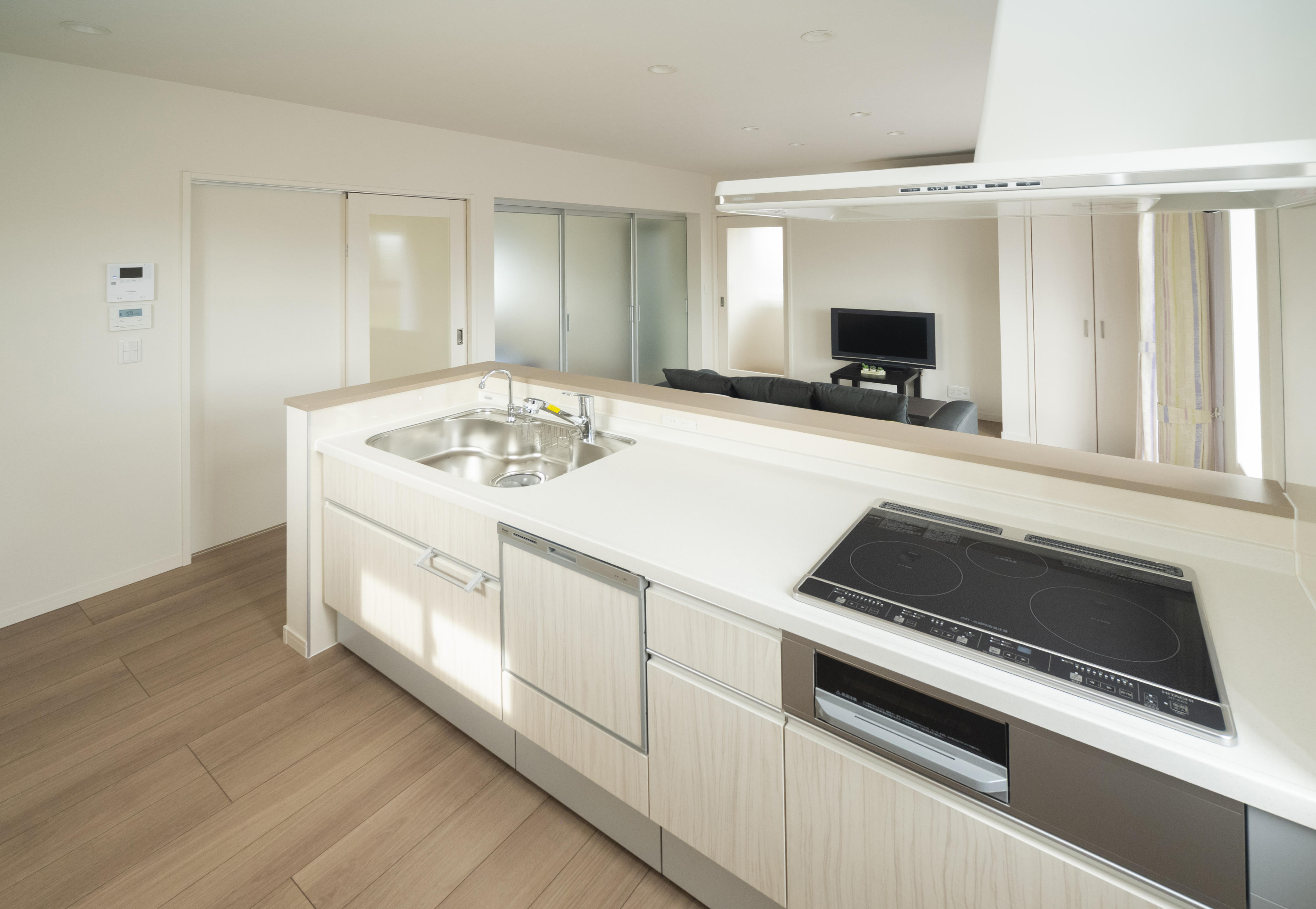 開放感のあるキッチン。ダイニングテーブルを置かず、キッチン手前のカウンターでお食事ができるので動線のいい空間になっています。