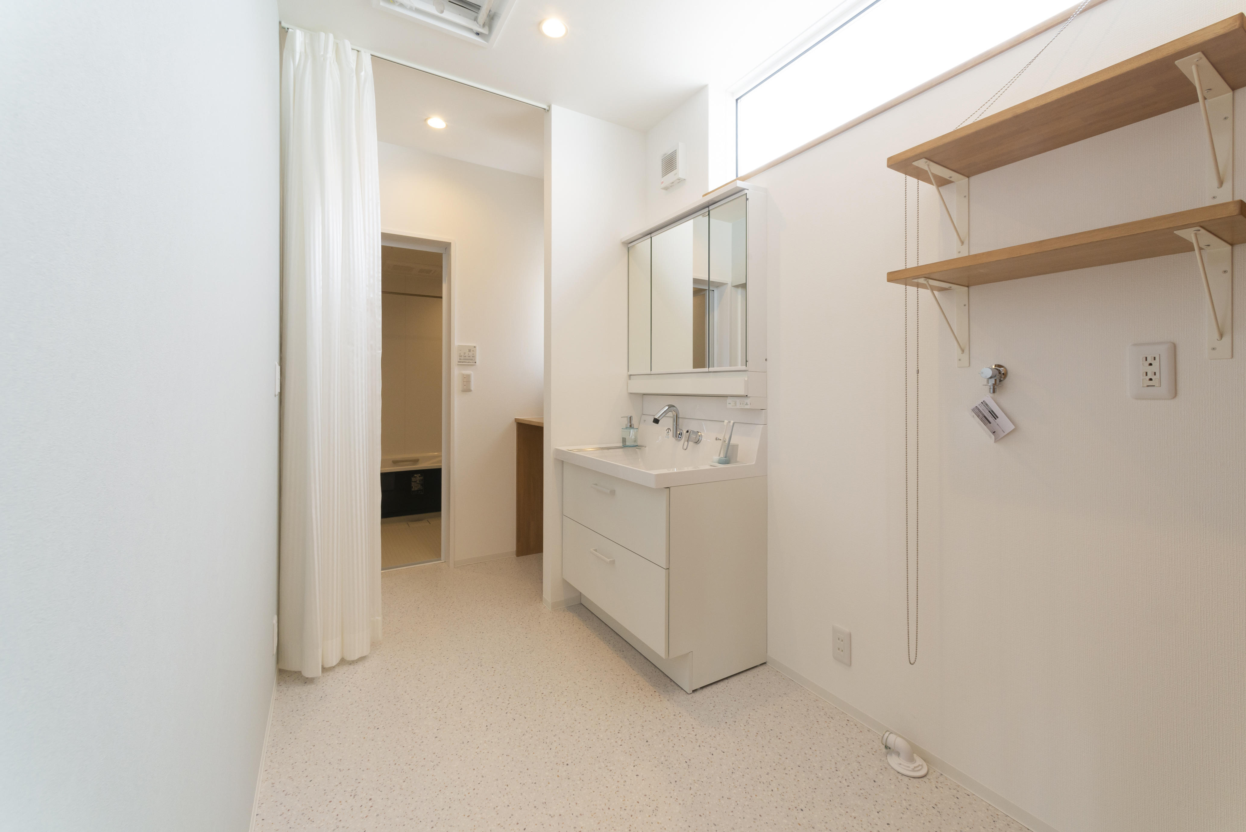 洗面所は家事スペースとして使いたい、と通常より一回り大きめサイズにした洗面脱衣室。電動の物干し竿を設置して、共働きのご夫婦でも室内干しができるようにしています。また脱衣室と洗面所を1つのスペースとして使用できるように、あえてアコーディオンのカーテンを設置しました。